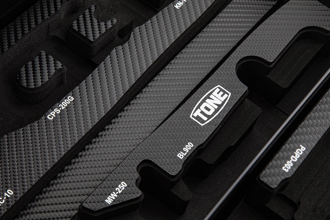また、ベースカラーがブラックとなるツールケースは、高級感あふれるカーボン調トレーを採用しており、トレーには製品のサイズや製品番号を表示し、整理整頓・紛失防止に役立ちます。