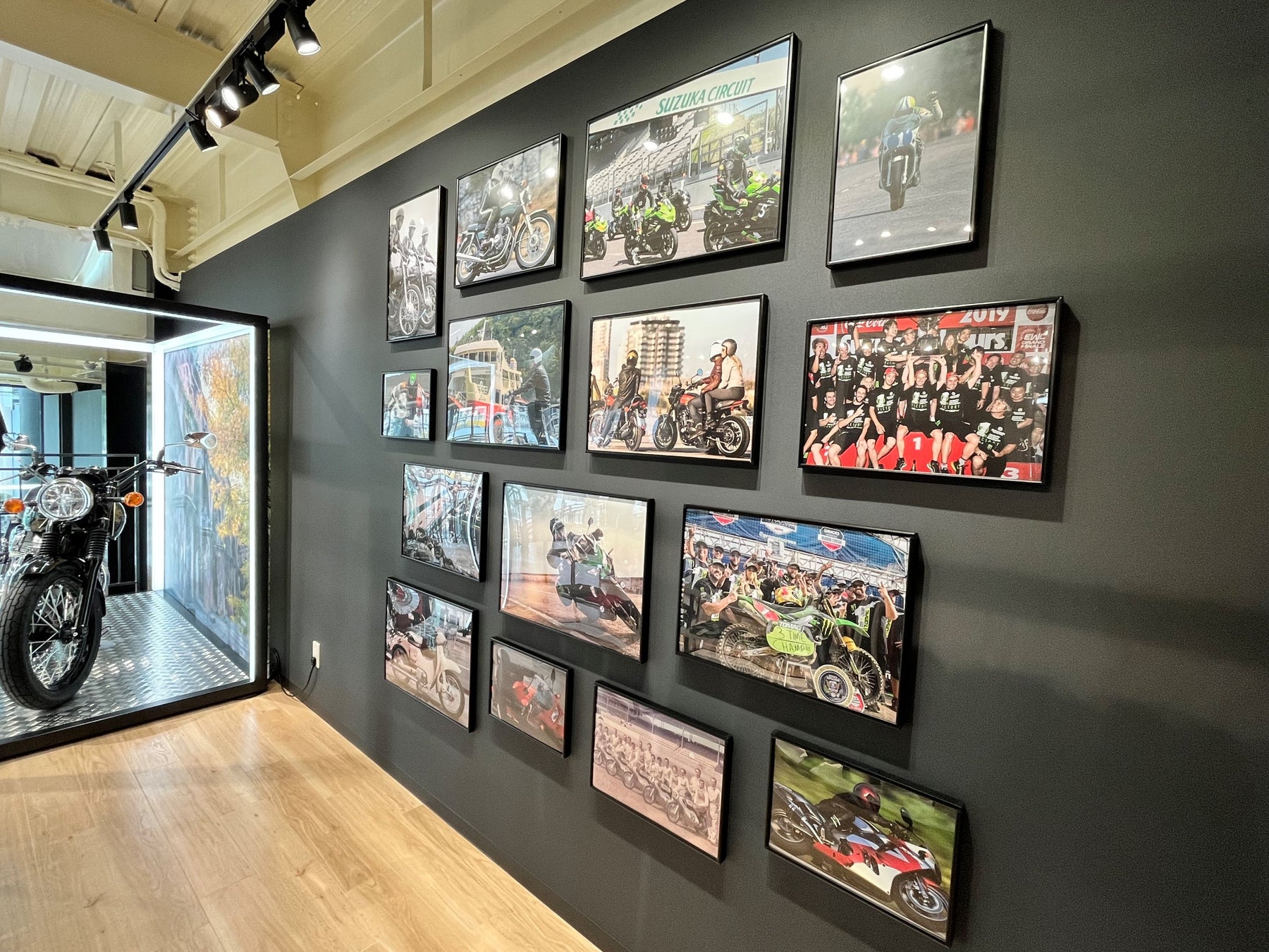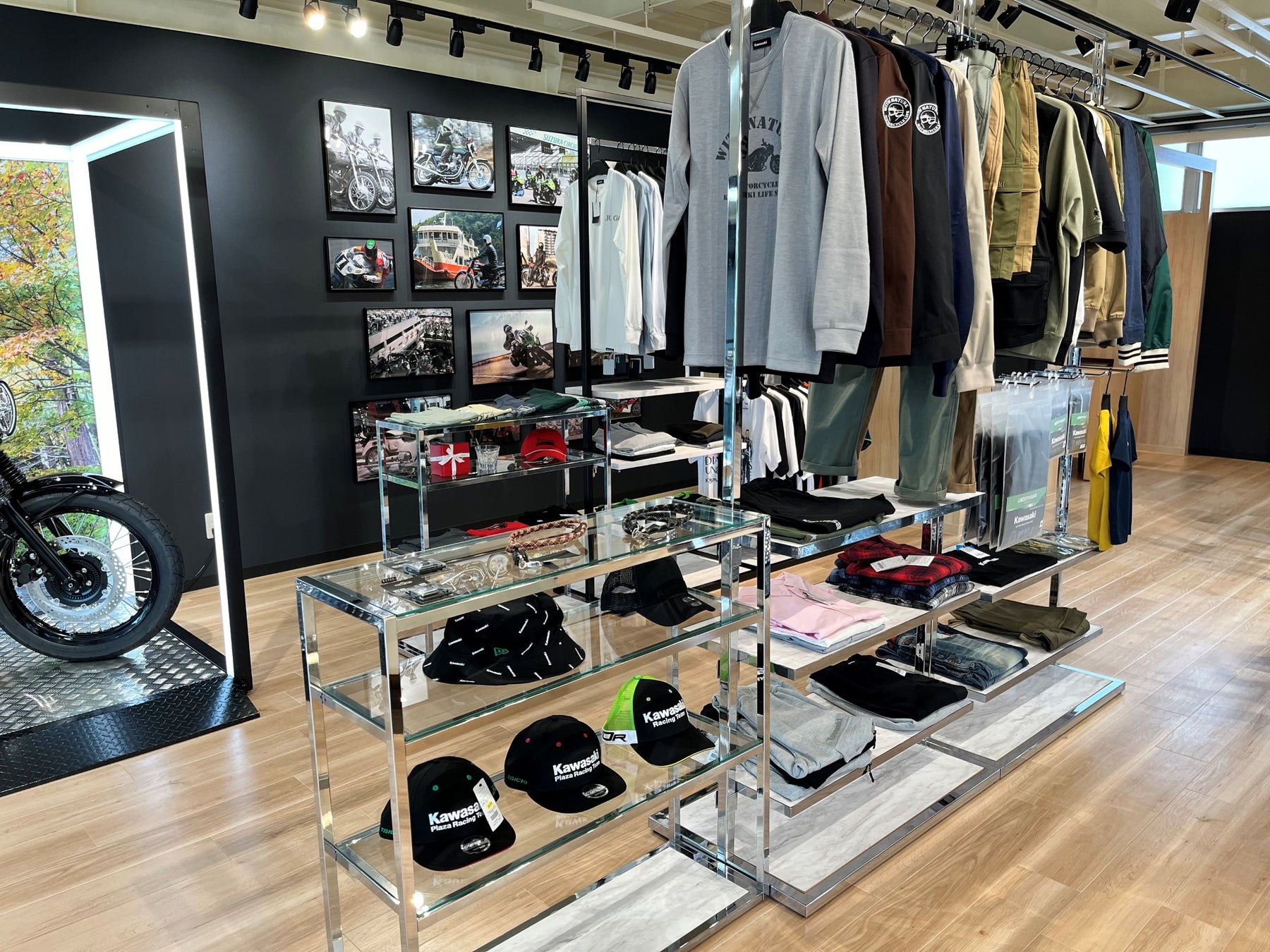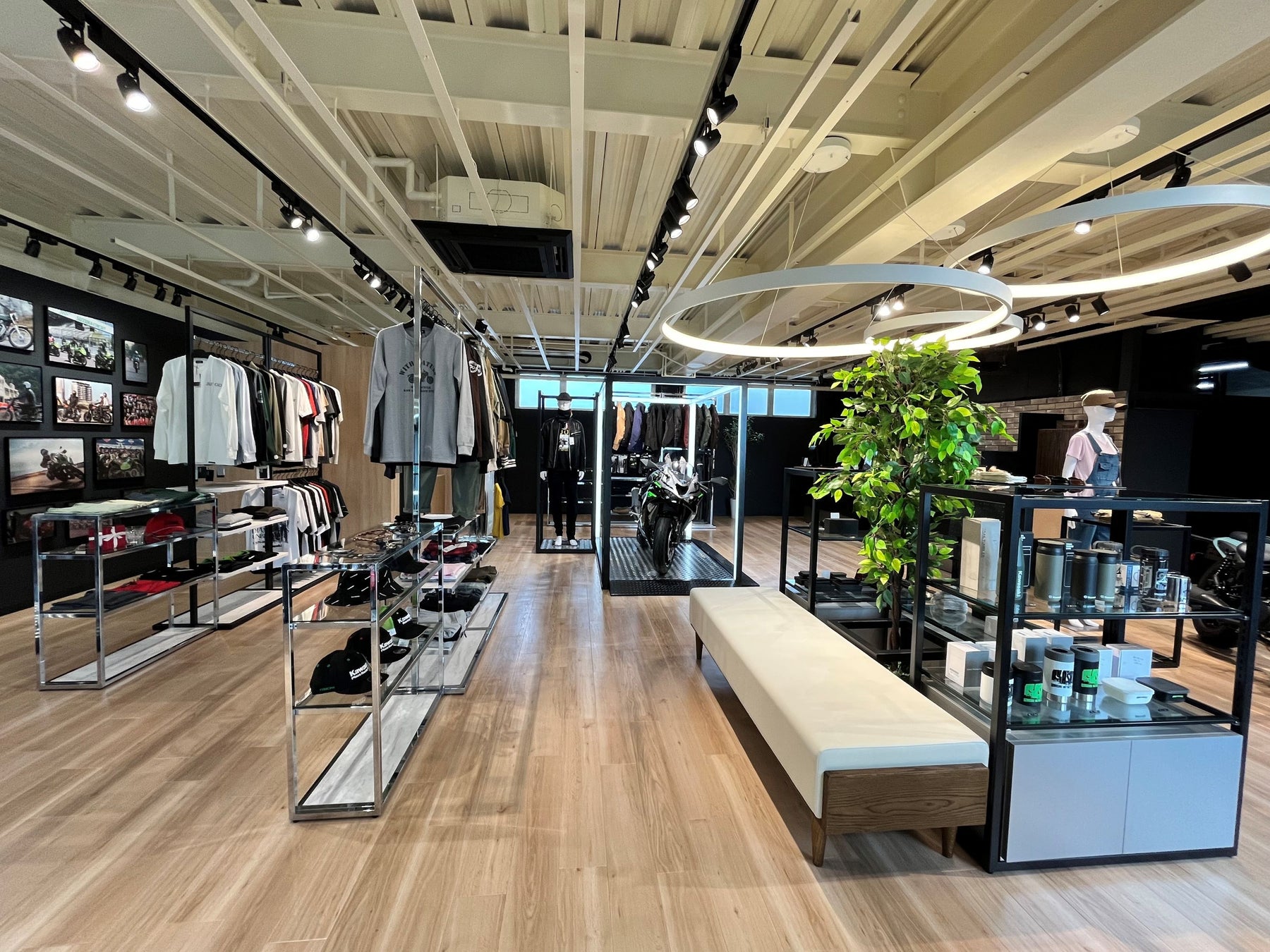 木目調のフロアと白い天井が織りなす明るい店内。モーターサイクルとプラザアパレルがゆったりと展示され、どなたでも楽しめる空間としています。