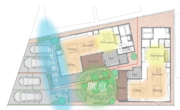 旗竿地の住環境課題と街並み形成への影響を解決し、旗竿地の新たな可能性を見出す。旗庭・すり鉢形状・門棟を軸に、旗竿地に住まう人の生活を豊かにし、地域に良好な街並みを形成して新たな景色を創出する。