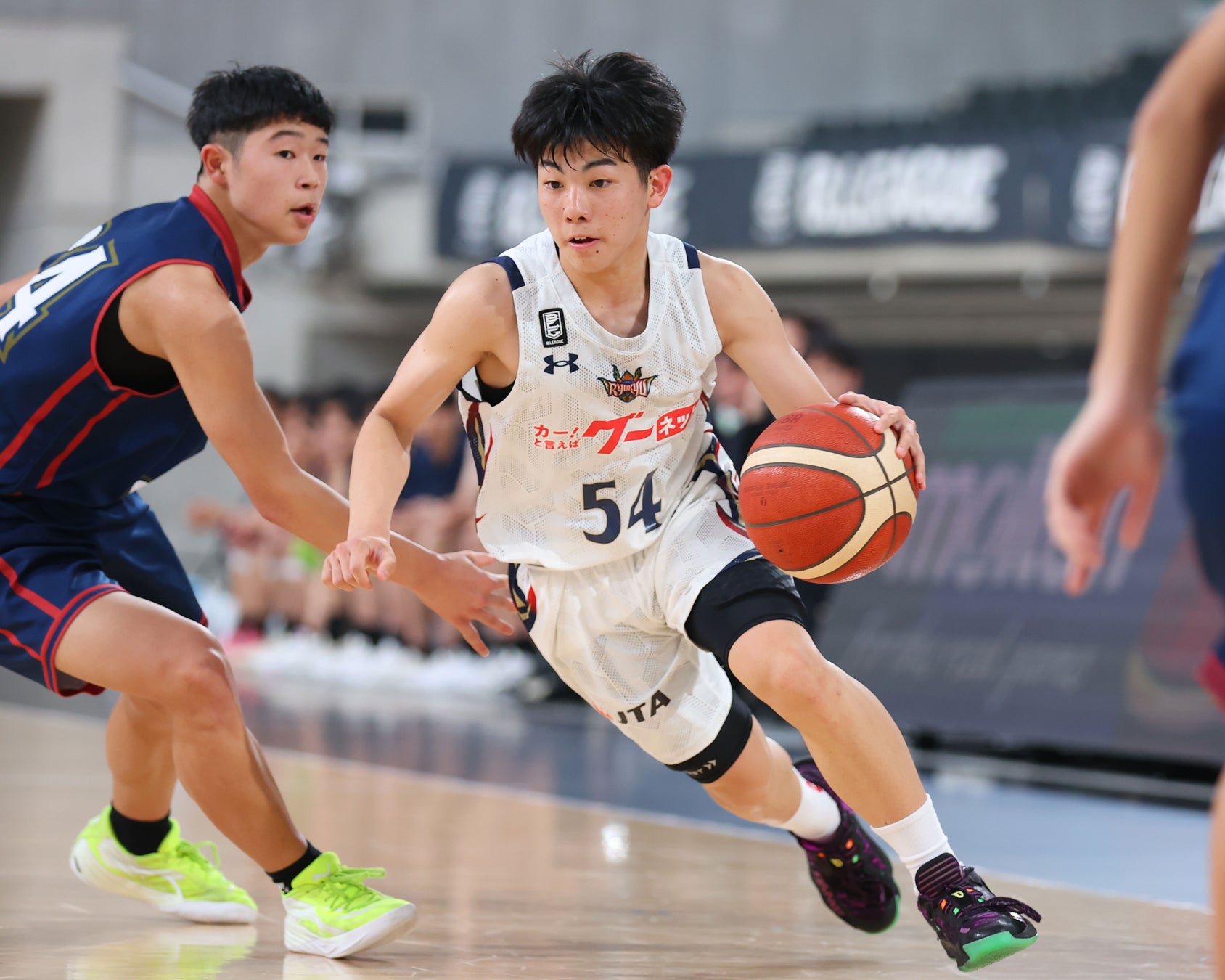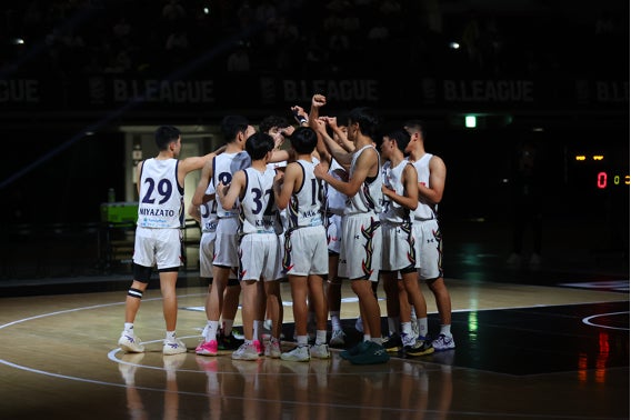 決勝トーナメント1回戦の佐賀バルーナーズU15戦では拮抗した展開が続くも、#54 越選手が27得点、#29 宮里選手が14得点の活躍で終盤に突き放して勝利。準々決勝では、#54 越選手が27得点、要所ではキャプテンの#10 亀谷琉斗選手が3Pシュート3本を含む12得点など、本大会3連覇中の名古屋ダイヤモンドドルフィンズU15を破りました。