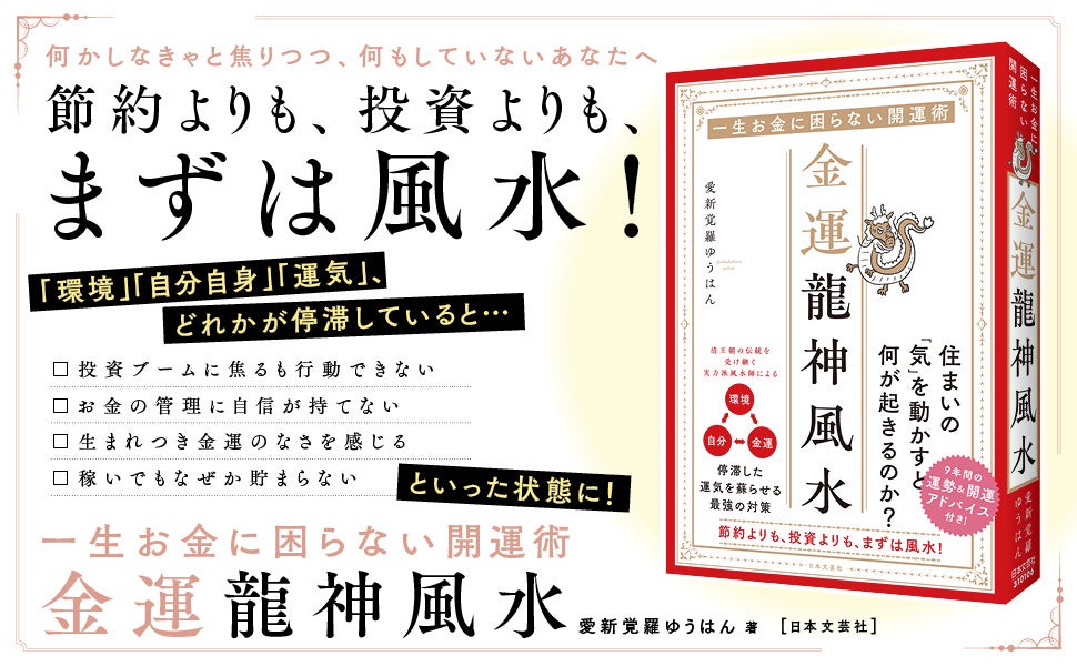 株式会社日本文芸社(東京都千代田区)は、『金運龍神風水』(愛新覚羅 ゆうはん 著) を2025年2月18日(火)より全国の書店・オンライン書店等で発売いたします。
