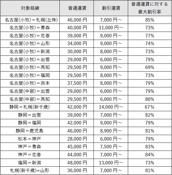 普通運賃に対して最大85%(名古屋(小牧)=札幌(丘珠)線の一例です)