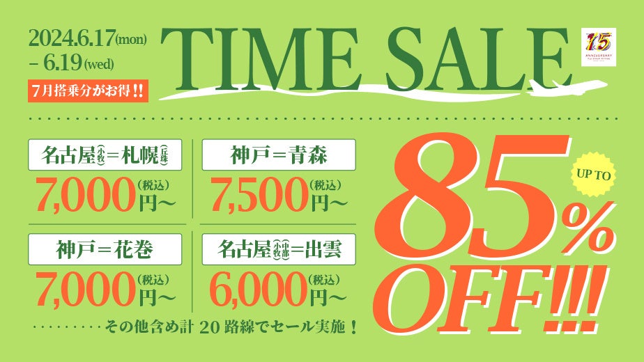 この「タイムセール」は、20路線を対象に、2024年7月1日(月)~7月31日(水)ご搭乗分の航空券が最大で85%割引となるもので、2024年6月17日(月)10:00より販売開始いたします。