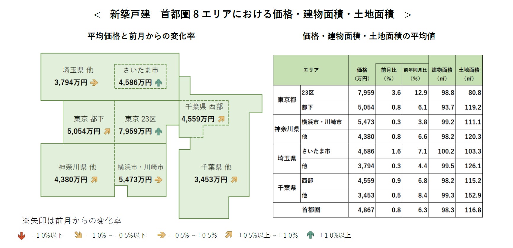 ●首都圏の新築戸建の平均価格は4,867万円で、前月比+0.8%と3カ月連続で上昇。前年同月比は+6.3%と14カ月連続で上昇。