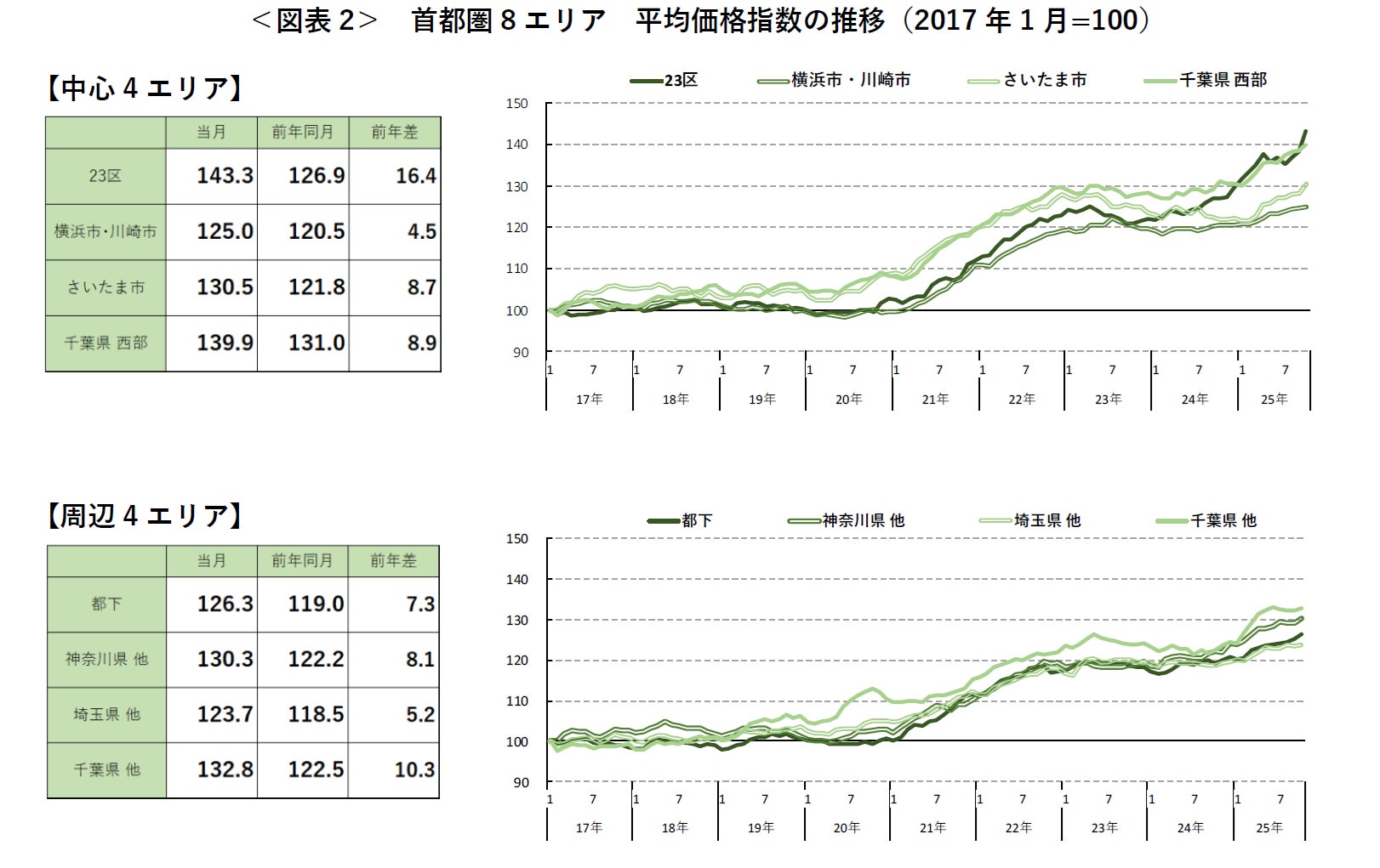 なお、東京都(23区/都下)、神奈川県(横浜市・川崎市/他)、埼玉県(さいたま市/他)、千葉県西部の7エリアは2017年1月以降最高額を更新した。