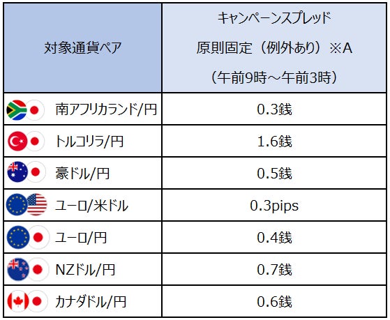 ※キャンペーンスプレッドの提示時間帯はすべて対象期間中の各営業日の午前9時~翌午前3時。同期間中の通常スプレッドは各営業日の午前3時~午前9時に提示。