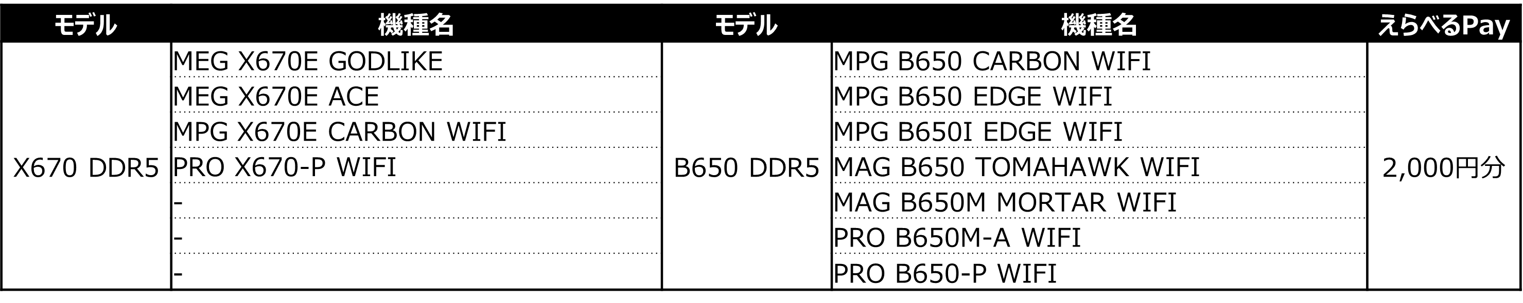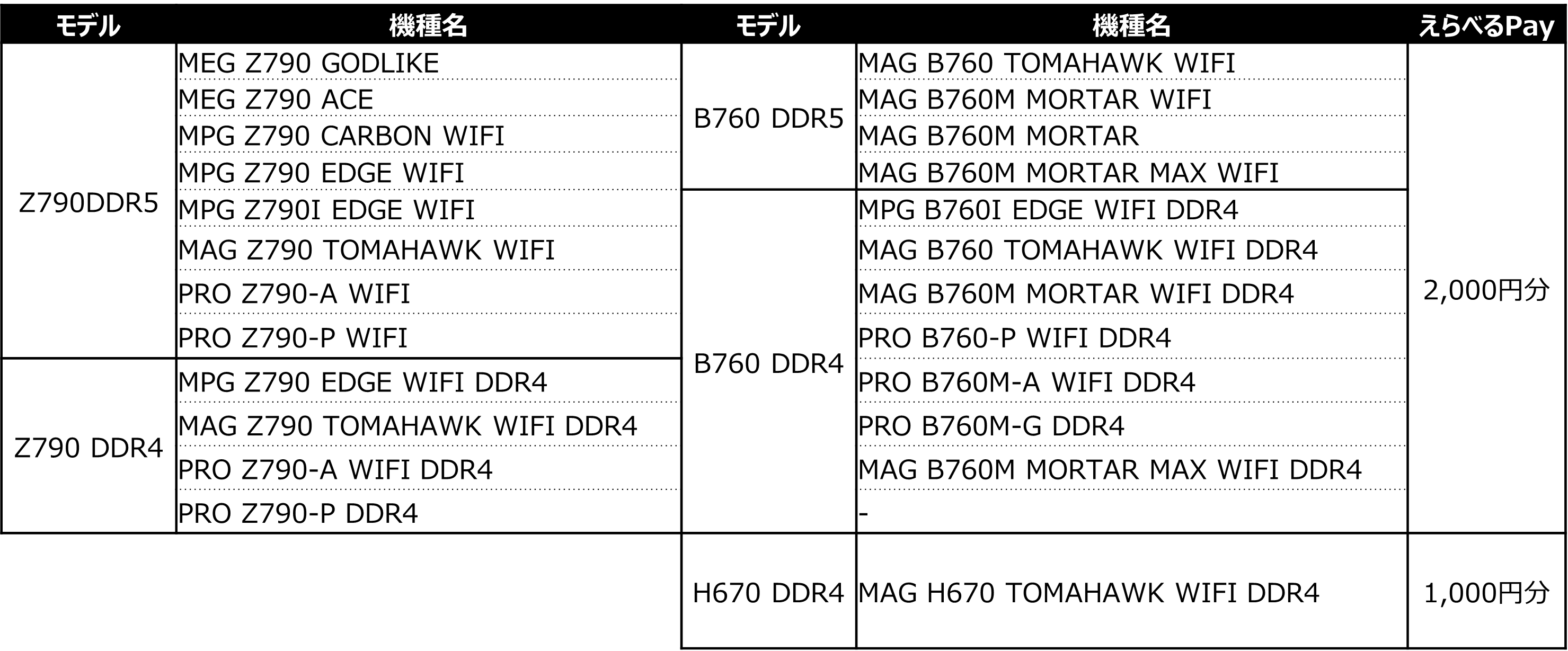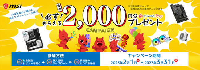 この度、エムエスアイコンピュータージャパン株式会社は、2023年2月1日(水)~2023年3月31日(金)までの間、対象のZ790/B760/H670/X670/B650チップセットを搭載したマザーボードと一部のMSI簡易水冷クーラーや電源ユニットを購入後、価格.comなどの指定サイトにレビューを投稿いただいた方全員に、最大2,000円分のえらべるPayをプレゼントする「23初春レビューキャンペーン」を開催いたします。