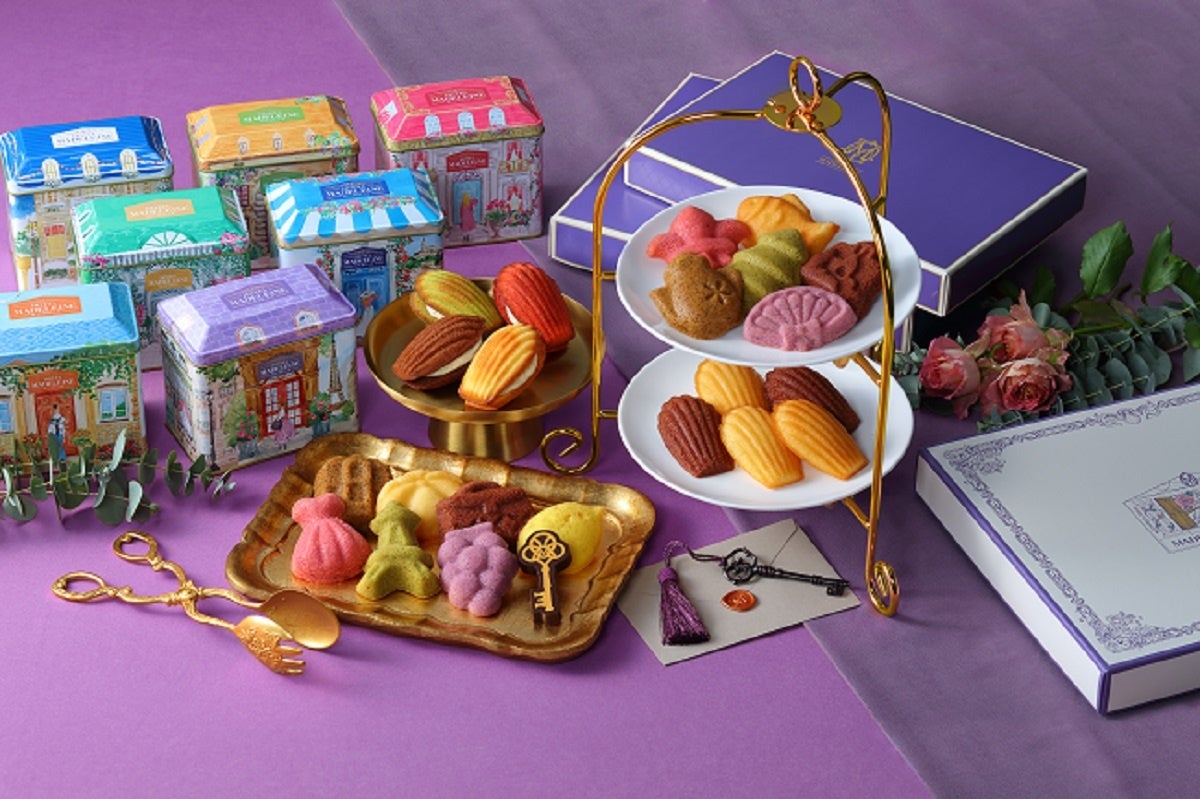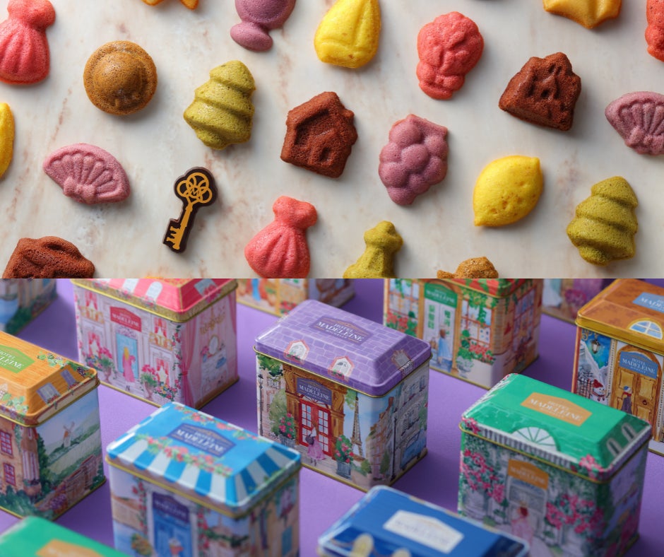 フランスのさまざまな街をイメージした、色とりどりの10種の缶には、マドレーヌ4種とカギの形の「キーチョコレート」1個が入っています。