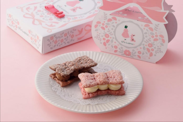 ミシェルのお気に入りのリボンをモチーフにしたクリームサンド。うっとりする香りのバニラクリームとフランボワーズパイ、うっとりする香りのバニラクリームとフランボワーズパイ、こうばしいコーヒークリームとショコラパイの2種の組み合わせを楽しめます。