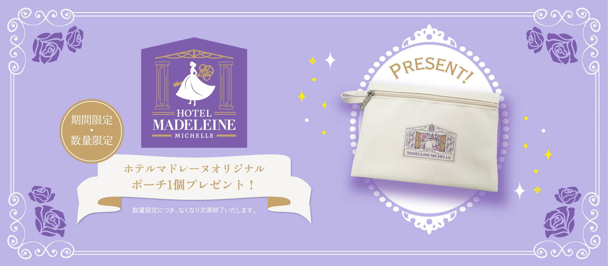 期間中、[ホテルマドレーヌミシェル]にて税込2,160円以上お買上げのお客様各日先着100名様に、【オリジナルポーチ】を1点プレゼントいたします。