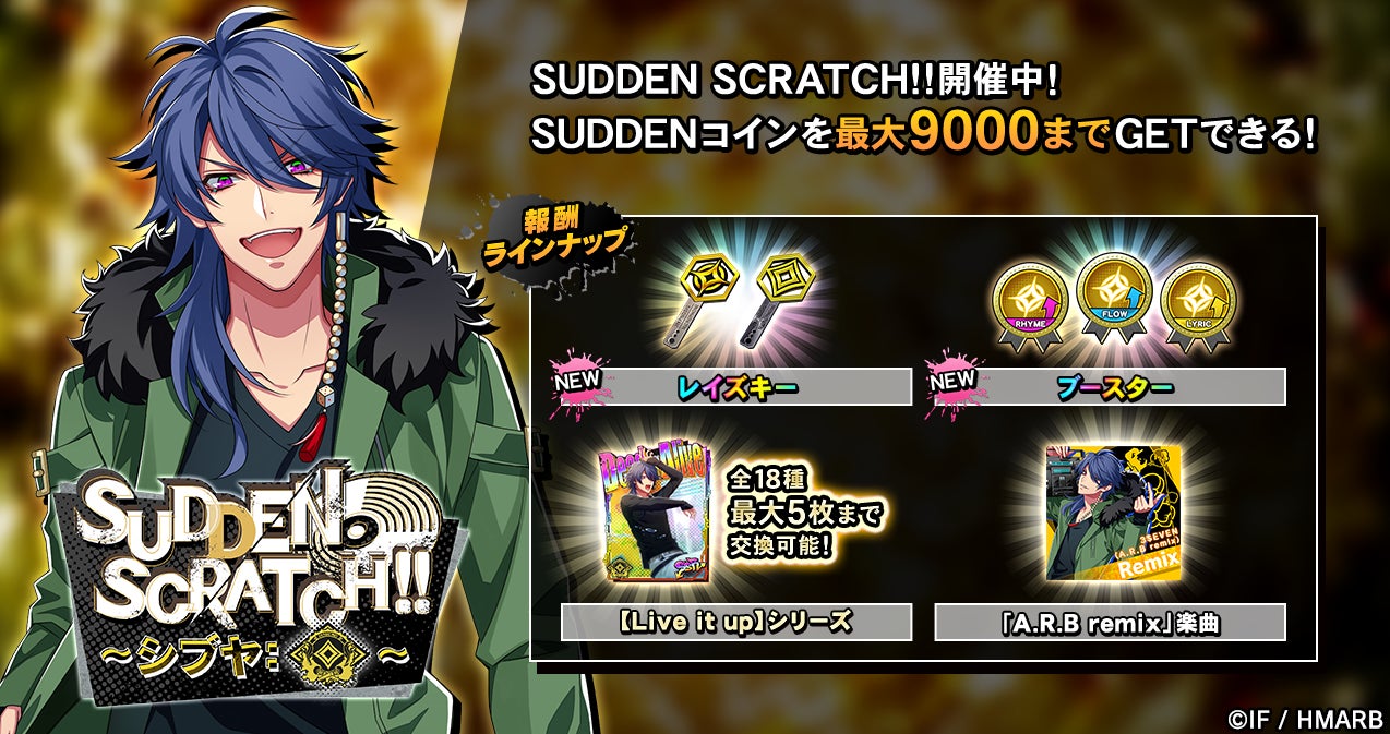 イベント期間中、KILLER SCRATCH!!をプレイするとライズ消費量に応じた確率でSUDDEN SCRATCH!!が発生します。SUDDEN SCRATCH!!をプレイすると、通常の報酬アイテムの他、限定アイテム「SUDDENコイン」を獲得することができます。「SUDDENコイン」を集めることで、レイズキーやシブヤ・ディビジョンのデコステッカーに使えるブースターなどと交換することが可能です。他にも、ストーリーカードの【Live it up】シリーズ、「A.R.B remix」楽曲などがラインナップされています。詳細はアプリ内お知らせをご確認ください。
