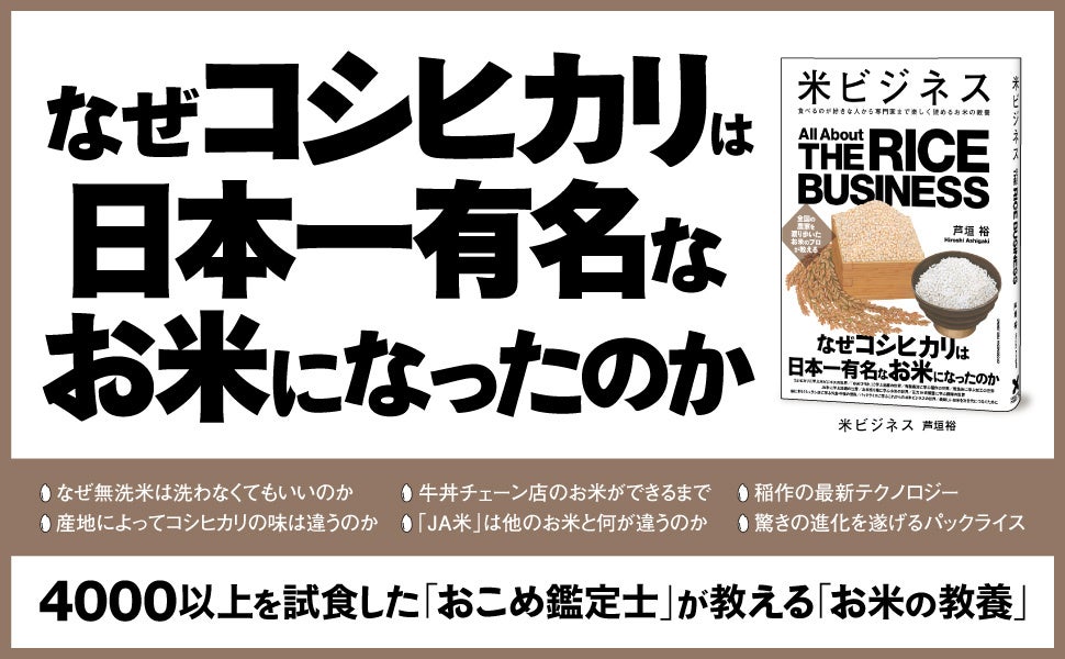 本書は、累計3万部を突破した『魚ビジネス』をはじめ、『肉ビジネス』『野菜ビジネス』に続く教養シリーズの第4弾。著者は横浜にある老舗米屋の3代目で、自身も「お米マイスター」として数多くの品評会に参加し、全国の米農家を渡り歩いた米のプロ・芦垣裕氏です。今まで、鑑定士として4000以上のお米を食べてきました。