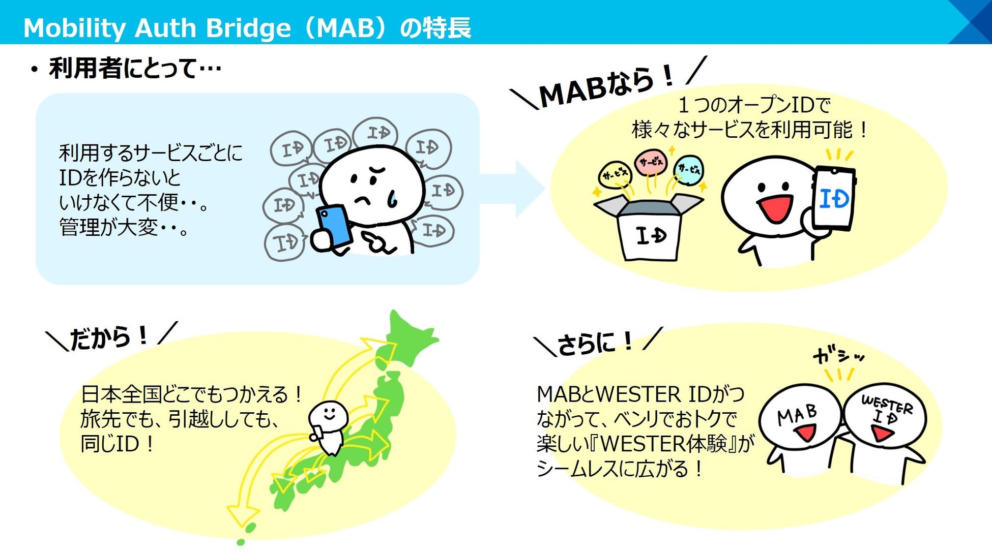 また、JR西日本グループ共通IDであるWESTER IDと連携し(2024年度中に実施予定)、MABを導入いただく自治体や企業が提供するサービスとWESTERサービスのそれぞれの利用実績に基づきWESTERポイントを付与するなど、さまざまなデジタルサービスにおけるMABを通じた段違いに”便利” ”おトク” ”楽しい”WESTER体験をご利用者に提供することができます。