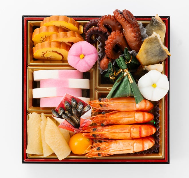 伊達巻、花餅紅梅、紅白市松蒲鉾、数の子、きんかんさわやか煮、田作り奉書、たこ照焼、近江牛笹包み、縞ホッケ西京焼、海老艶焼、花餅白梅