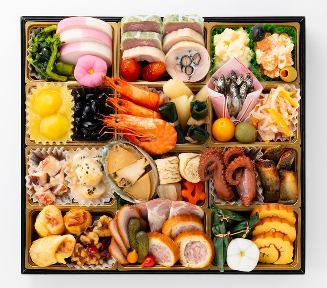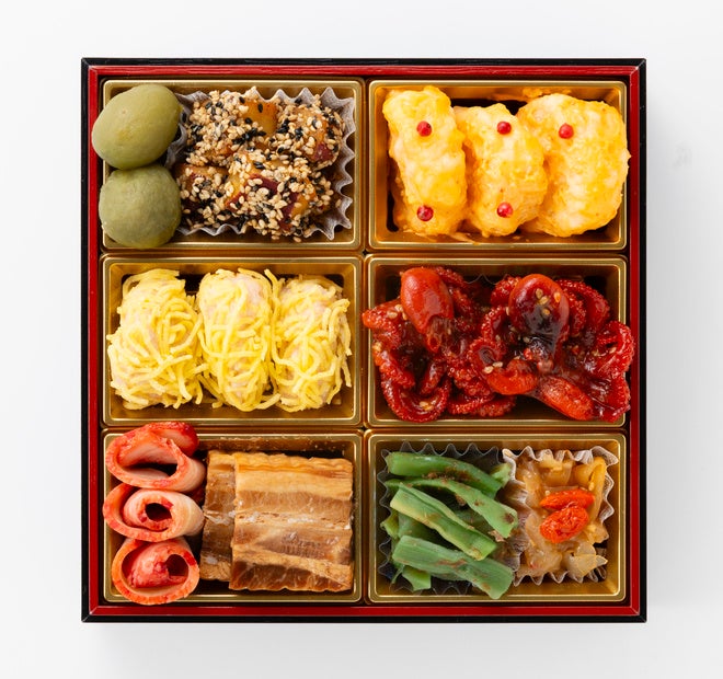 菜の花辛し和え、紅白市松蒲鉾、花餅紅梅、黒豆煮、栗甘露煮、きんとん、いか燻製風サラダ、ロブスターのホワイトソース和え、サラミ風パイ焼、クランベリークルミ、ビーフテリーヌ、チキンガランティン、ドライトマト赤ワイン煮、海老艶焼、数の子、昆布巻き、若布、鮑旨煮、焼き湯葉巻、赤花こんにゃく旨煮、白花こんにゃく旨煮、黒糖ローストポーク、合鴨スモーク、コルニッションピクルス、ペッパードロップ、イエローペッパードロップ、ソーセージトゥールーズのブリオッシュ包み、北欧サラダ、ライプオリーブ、明太風味サラダ、スタフドオリーブ、田作り奉書、きんかんさわやか煮、マンゴー甘露煮、伊予柑紅白なます、たこ照焼、縞ホッケ西京焼、近江牛笹包み、伊達巻、花餅白梅