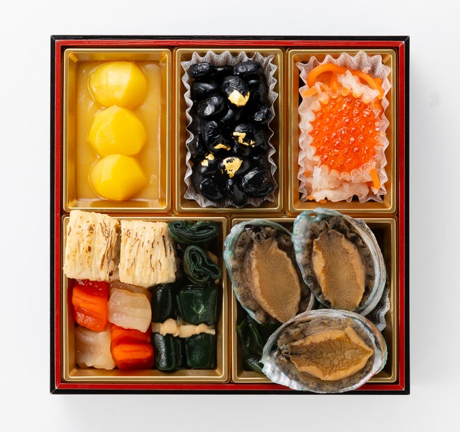 きんとん、栗甘露煮、湯葉巻、赤花こんにゃく旨煮、白花こんにゃく旨煮、昆布巻、黒豆金粉飾り、若布、鮑旨煮、紅白なます、醬油いくら