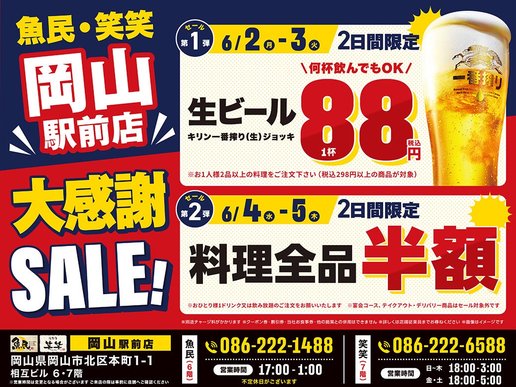 また、近隣の「魚民 岡山駅前店」「笑笑 岡山駅前店」の2店舗でも同時セールを開催!!