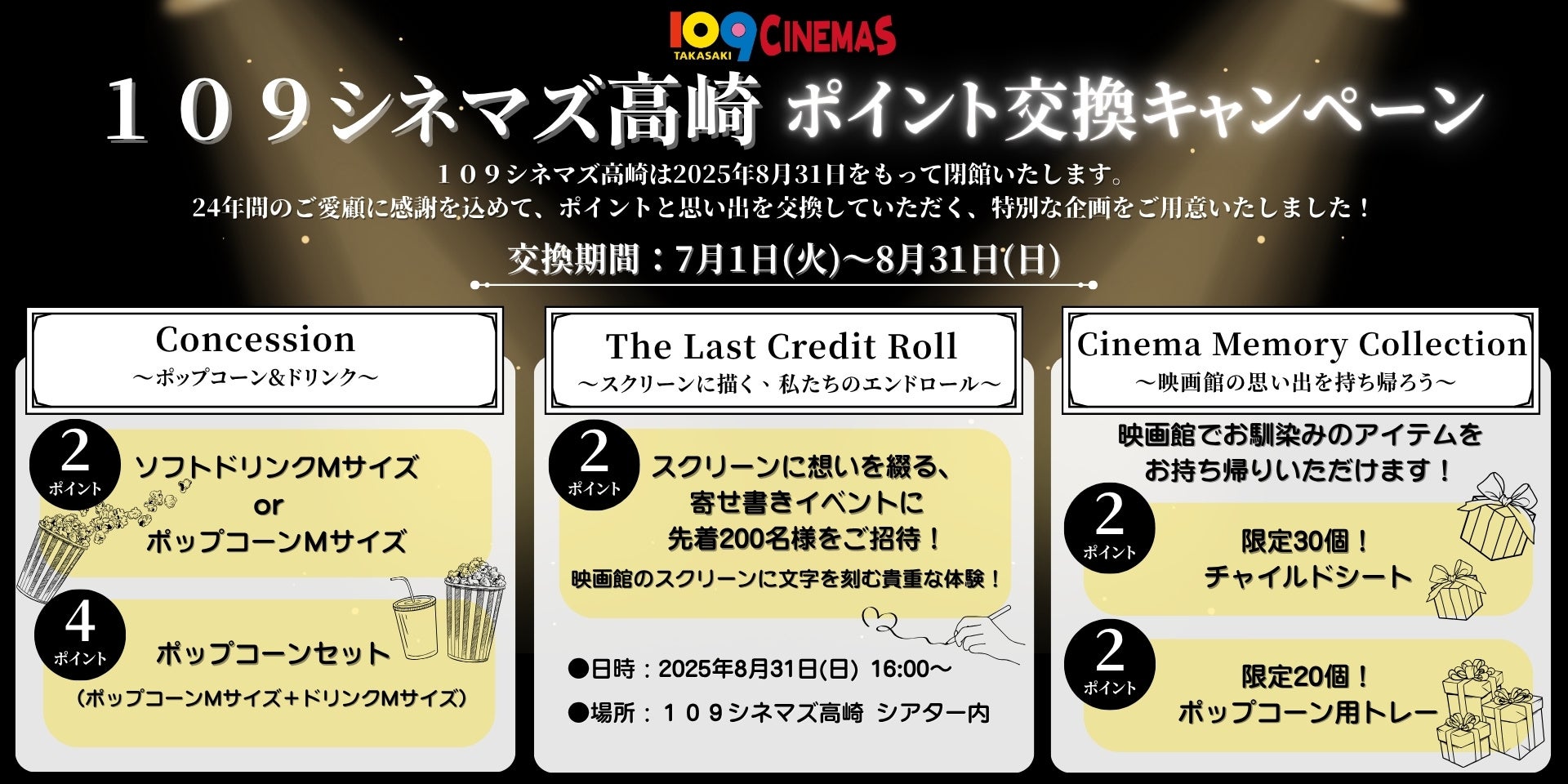 8月31日(日)の最終上映終了後に、スクリーンに寄せ書きができる閉館日ならではのイベントを実施します。2ポイント引換でこのイベントに先着200名様をご招待いたします。109シネマズ高崎への想いなどお好きなメッセージをご自由にお寄せいただき、最後に集合写真の撮影を予定しております。皆様のご参加を心よりお待ちしております。