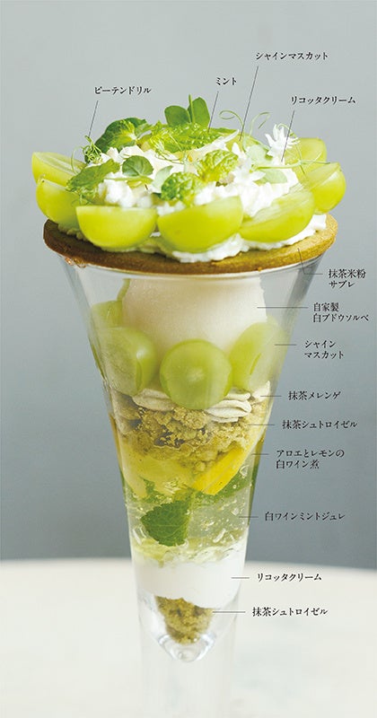 旬のシャインマスカットをふんだんに使用して再登場。米粉やラカントを使用しギルトフリーなパフェに仕上げました。花冠をイメージしたトップには、リコッタチーズクリーム、下層には白ワインのジュレを重ね、アクセントに抹茶を加えました。最後までサッパリとお楽しみください。