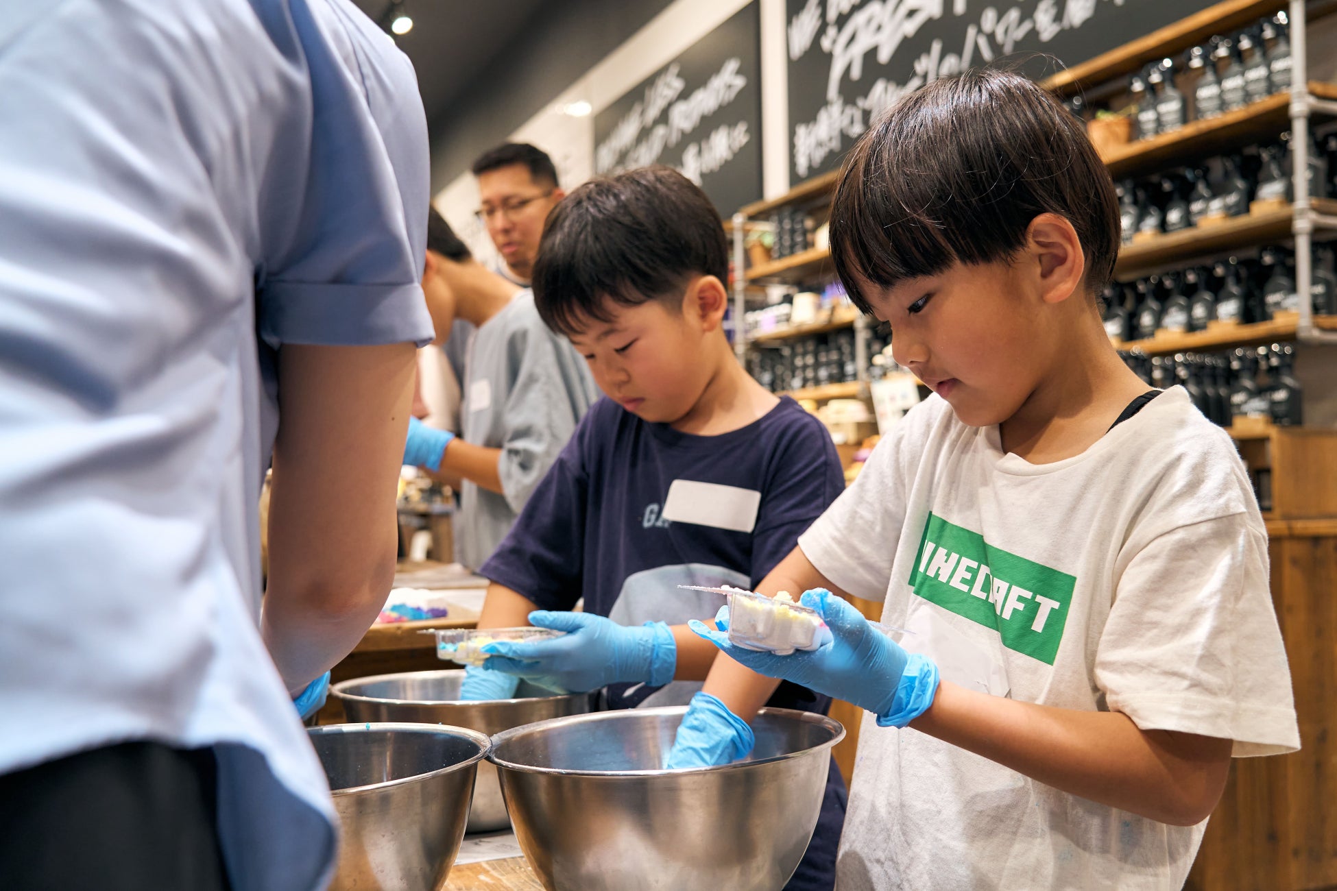 ラッシュの商品は、神奈川県愛川町にあるキッチンと呼ばれる製造工場で作り手である「シェフ」によって一つひとつ想いを込めて丁寧に手作りしています。本体験では、ラッシュの商品を作るシェフとして商品の一部製造に取り組み、ものづくりの楽しさにふれることができます。本ワークショップでは、普段のラッシュ製造体験と同様の内容をエプロンを着用して体験できます。お土産に製造した商品をお持ち帰りいただけます。