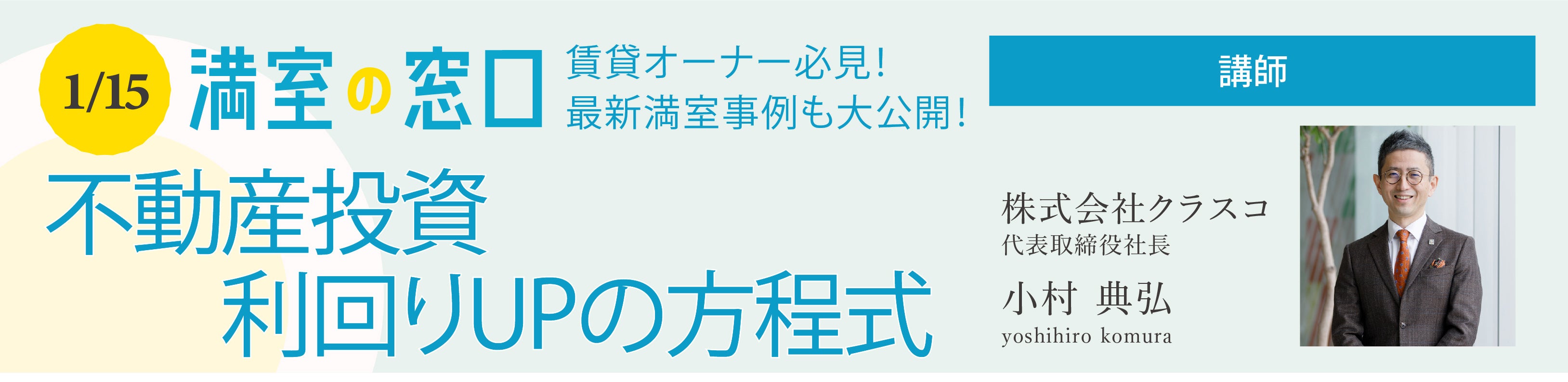 株式会社クラスココンサルファーム(本社:石川県金沢市/代表取締役社長:小村典弘)は、同社が運営する賃貸オーナー向け相談窓口ブランド「満室の窓口」において、2022年1月15日(土)に、全国の賃貸オーナーを対象とした無料オンラインセミナー「不動産投資 利回りUPの方程式」を開催します。