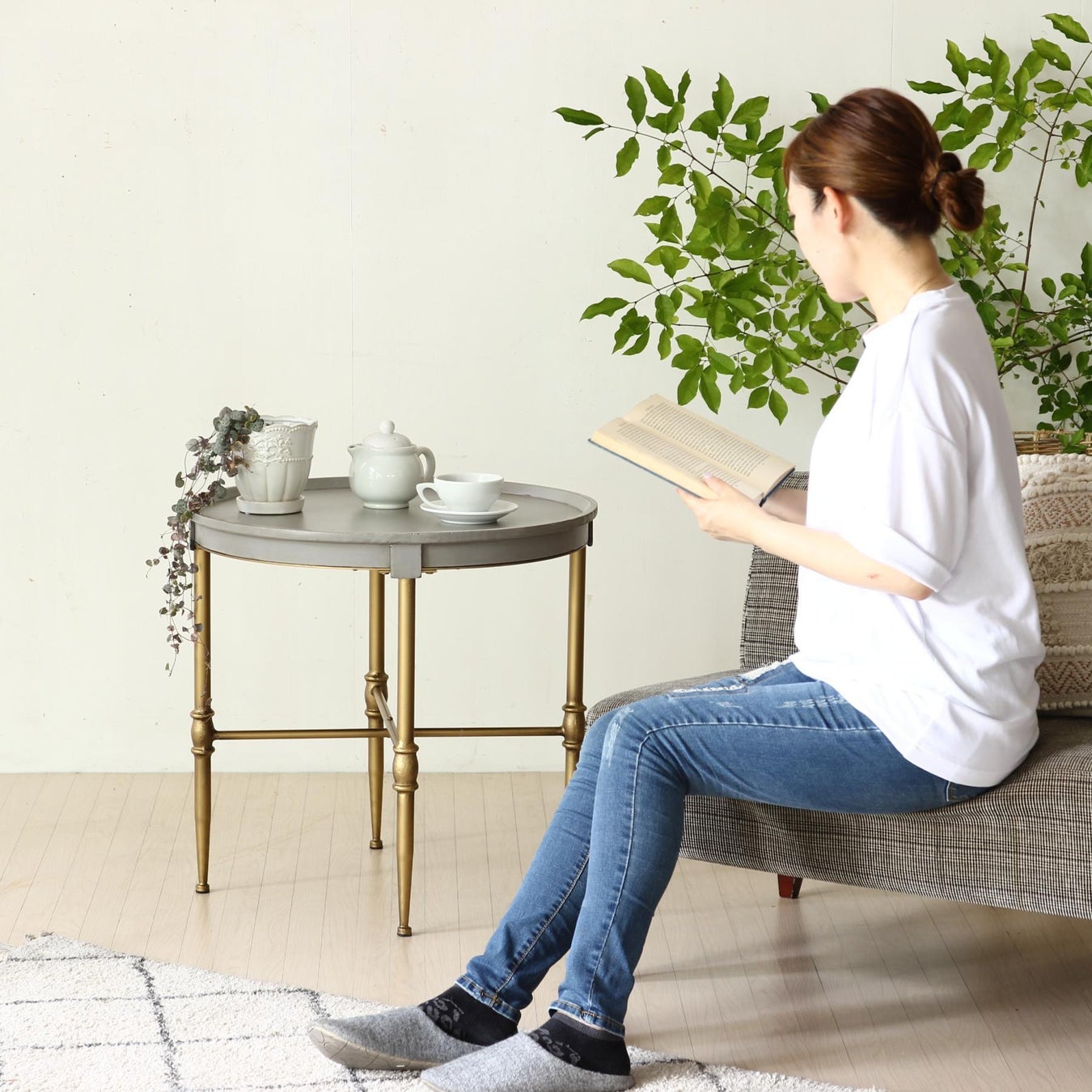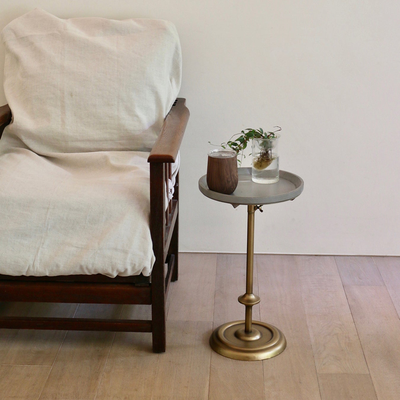 テーブルはソファスタイルの部屋に合わせやすい高さと大きさです。植物、本、アンティーク小物などはもちろん、普段使っているちょっとした日用品でさえおしゃれに見せてくれます。サイドテーブルとおすすめな「アジャスタブル ラウンドディスプレイ台」は高さの調整も可能です。