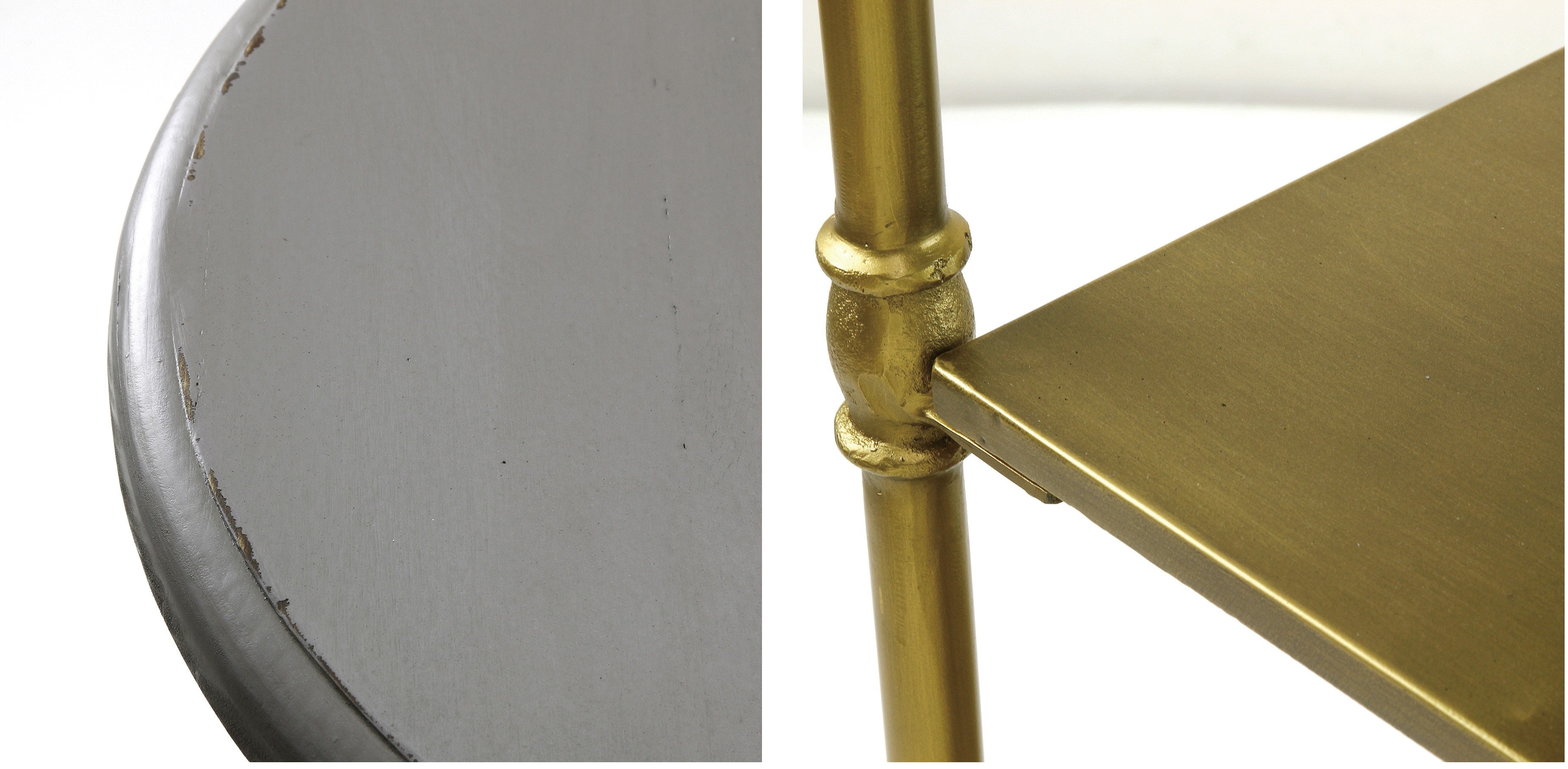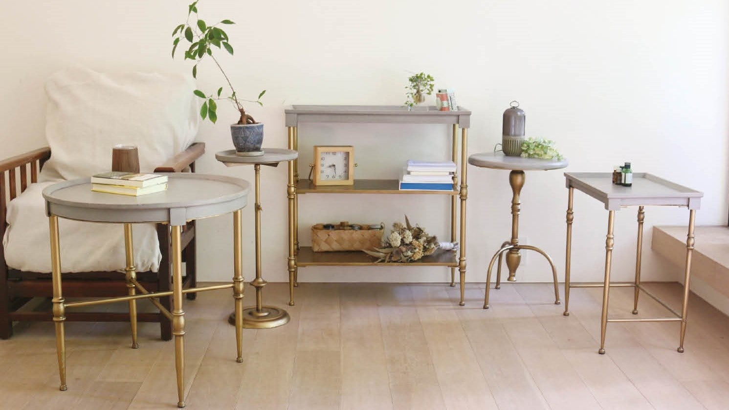 天板で採用しているグレーは強い主張をしないライトグレー。ナチュラル空間にもノーブルな空間にも合わせやすく汎用性の高いカラーです。さらにグリーンとの相性も良く、植物を合わせると落ち着きと温かみが合わさった空間に。脚のゴールドは光らせすぎず、アンティーク塗装をかけました。これから新しいインテリアを構築しようと思っている方にもお勧めのカラーです。