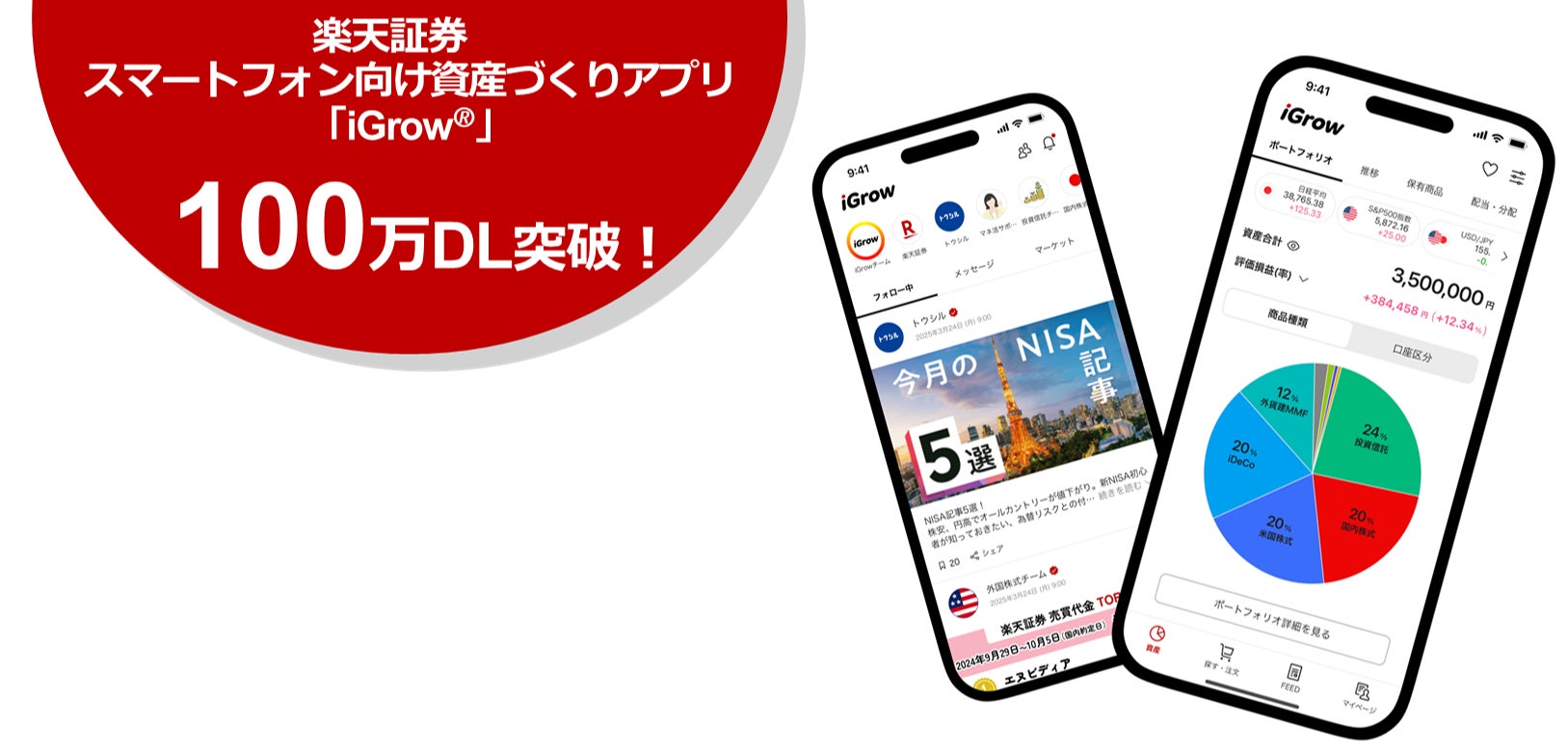 楽天証券の「iGrow®」は、投資が初めての方でも使いやすく、安心した資産づくりができる、楽天証券オリジナルのスマートフォン向け資産づくりアプリです。NISAを含む投資信託の購入・積立設定から、保有商品の管理までが完結できるほか、楽天証券の全対象商品・楽天銀行預金残高の資産推移や、保有する「楽天ポイント」をひとつのアプリでまとめて確認することが可能です。2024年12月25日(水)の提供開始以降、「一目でわかるデザインで、自分の資産状況が可視化でき、積立投資継続の背中を押してもらえた」、「楽天証券が選んだファンドセット『かんたんまとめ買い』で初心者でも簡単に分散投資ができた」などのお声をいただくほか、App Storeのファイナンス部門で5日間連続1位を獲得(※1)するなど、資産づくりを“はじめる”から“つづける”まで、数多くの方に活用いただいています。また、2025年6月27日(金)には、新たに配当・分配・利金の管理機能を追加し、業界で初めて(※2)年間で得られる予想金額(※3)も一目で確認することが可能になるなど、機能追加も継続的におこなっています。このたび、提供開始からわずか約6カ月で100万ダウンロードを突破することができたのも、多くの方に「iGrow®」の魅力をご評価いただいたものと考えています。