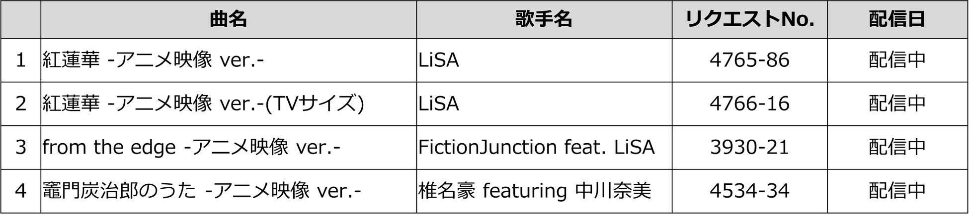 なお、DAMでは “テレビアニメ「鬼滅の刃」無限列車編”のOPテーマ「明け星」とEDテーマ「白銀」を1月30日にアニメ映像で配信したほか、 “テレビアニメ「鬼滅の刃」竈門炭治郎 立志編”の関連楽曲もアニメ映像で配信中です。アニメソングを歌いながら目で見て楽しめるカラオケとして、「鬼滅の刃」ファンに留まらず、多くのアニメファンの皆さまから好評を得ています。