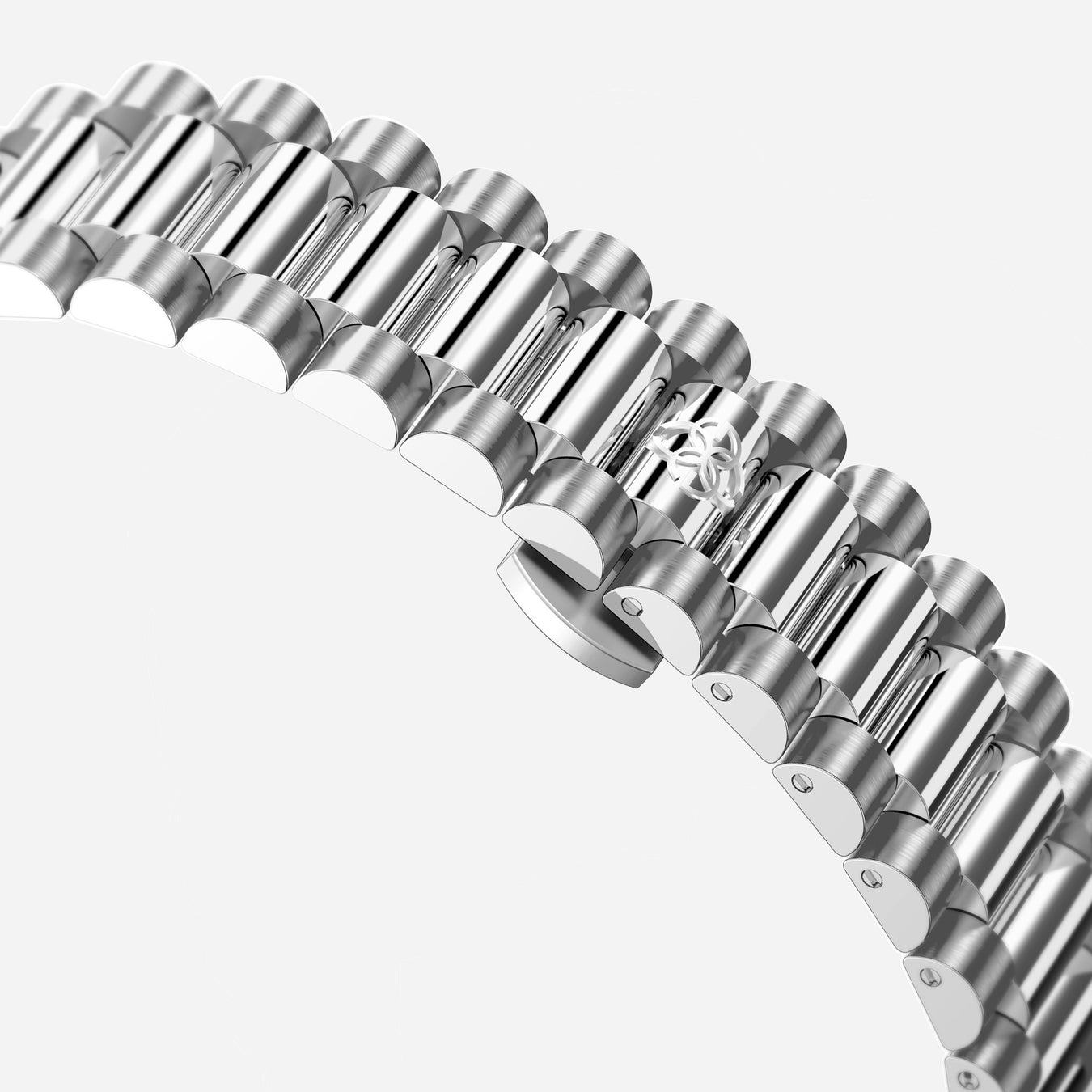 ステンレススチール製のハウジングとリンクブレスレットは、異なるポリッシュ仕上げが美しいコントラストを生み出し、洗練された調和とエレガンスを引き立てます。また、バックルにはシンプルで滑らかな機能性を備えたバタフライバックルを採用しています。
