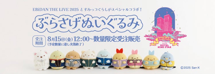 「EBiDAN THE LIVE 2025」とすみっコぐらしのスペシャルコラボとして、EBiDAN 9グループのホテルマン衣装を着たすみっコたちのぶらさげぬいぐるみが登場します。