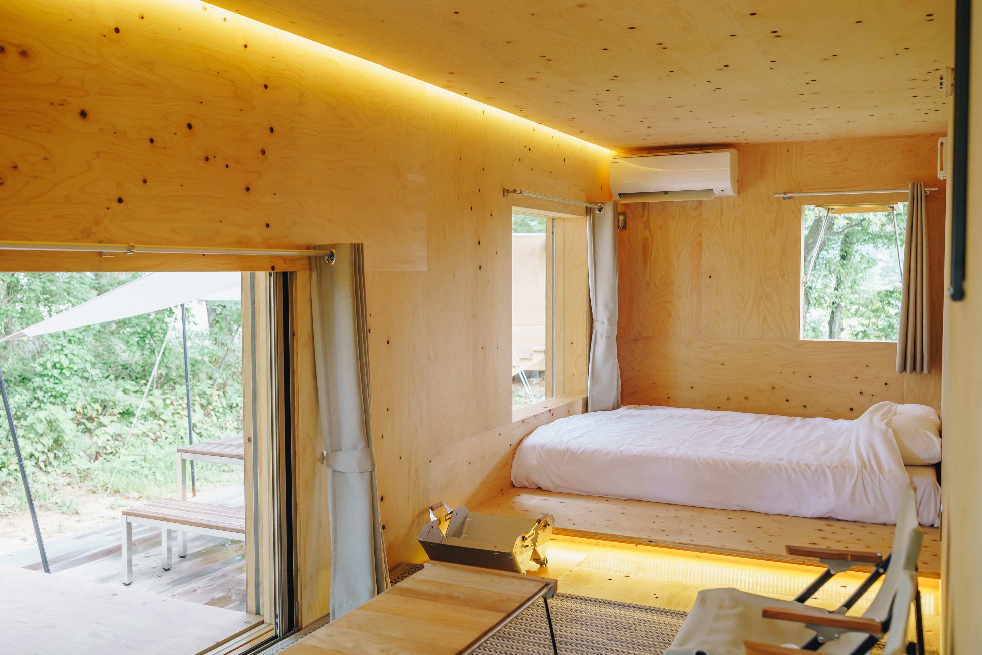 従来のテントから、建築家・隈研吾氏とスノーピークSnow Peakが共同開発したモバイルハウス「住箱-JYUBAKO-」へアップグレード。厳選されたスノーピークSnow Peak製品に囲まれ、木の温もりと高い機能性が調和する、モダンな非日常の空間が広がります。