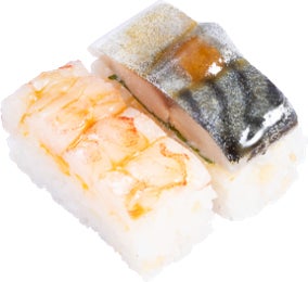 『押し寿司食べ比べ~とろ〆鯖・生えび卵黄ソース~』二貫363円(税込)