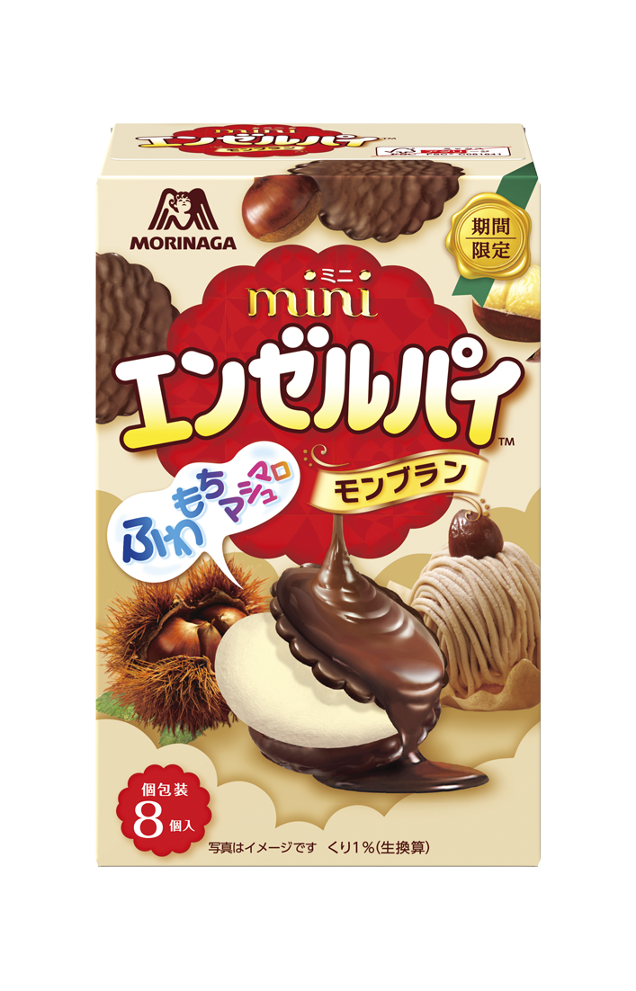 ふわもち食感のマシュマロをモンブランパウダーを練りこんだしっとりビスケットでサンドし、チョコレートでコーティングしたひと口サイズのエンゼルパイ。