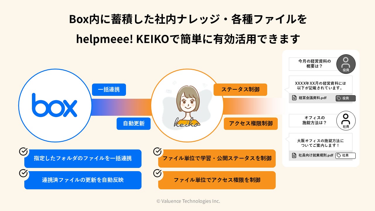 バリュエンステクノロジーズ株式会社(本社:東京都港区、代表取締役社長:田中 良介)が提供する、AIを通じて社内業務の効率化・高度化を実現するノーコードのDXソリューション「helpmeee! KEIKO(https://www.helpmeee.jp/)」は、株式会社Box Japan(本社:東京都千代田区、社長執行役員:佐藤 範之)が提供するインテリジェントコンテンツ管理プラットフォーム「Box」との連携機能を追加し、「Box」のエコシステムソリューションとして登録されたことをお知らせいたします。