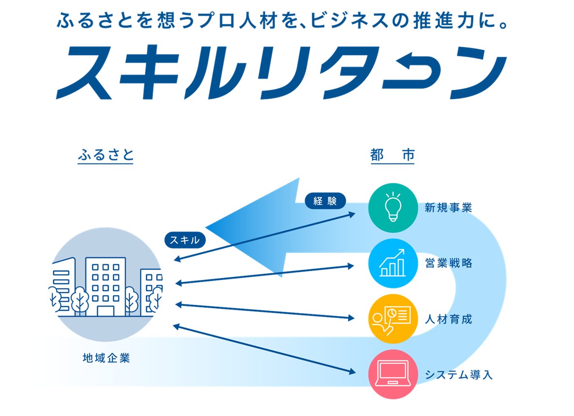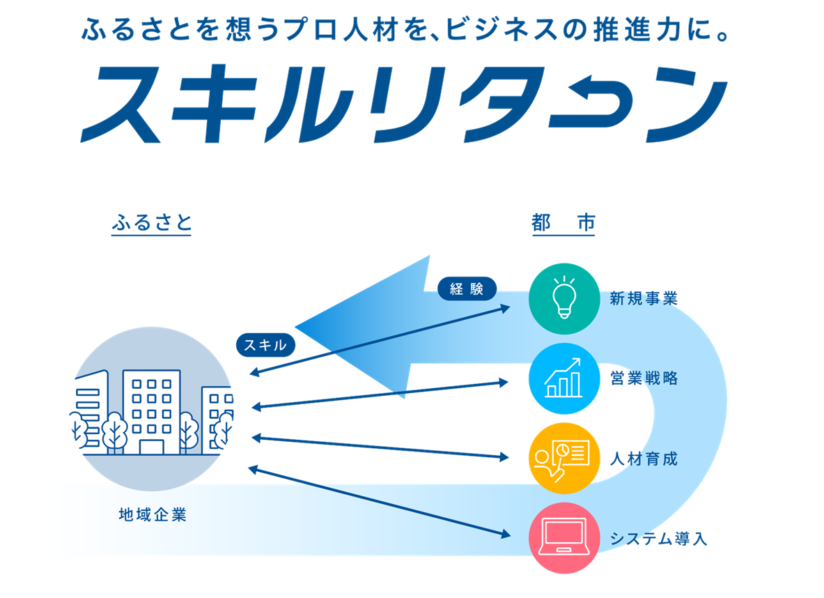 「スキルリターン」とは、都市部ではたらきながらも、「地域を発展させたい」「この企業の可能性を信じている」という想いを持つプロ人材のスキルを“ふるさと”に還元(リターン)する取り組みです。