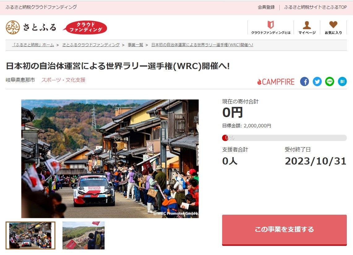 岐阜県恵那市とさとふる、日本初!自治体運営による世界ラリー選手権(WRC)の開催と開催地の地域振興を目指し寄付受け付けを開始