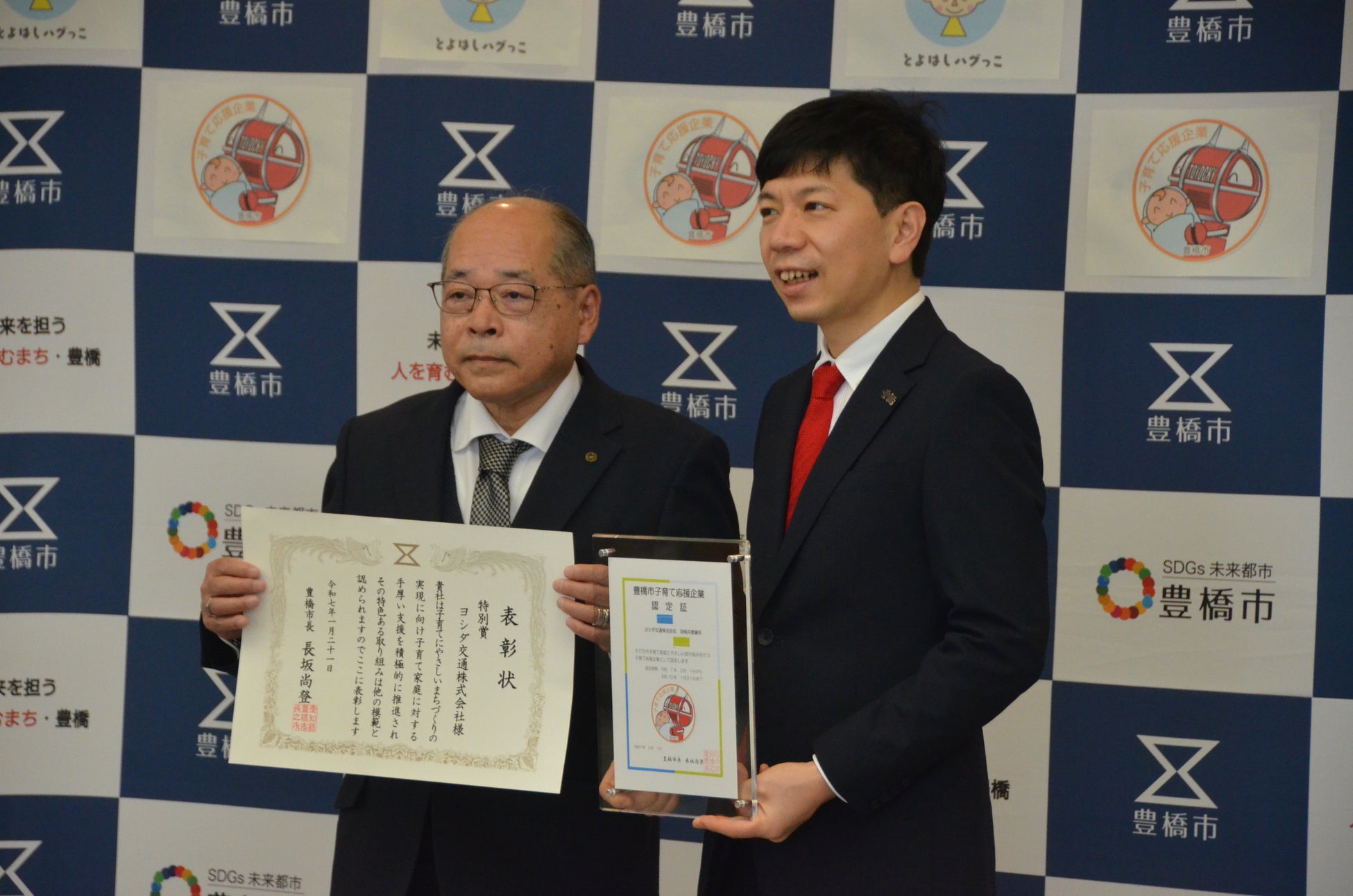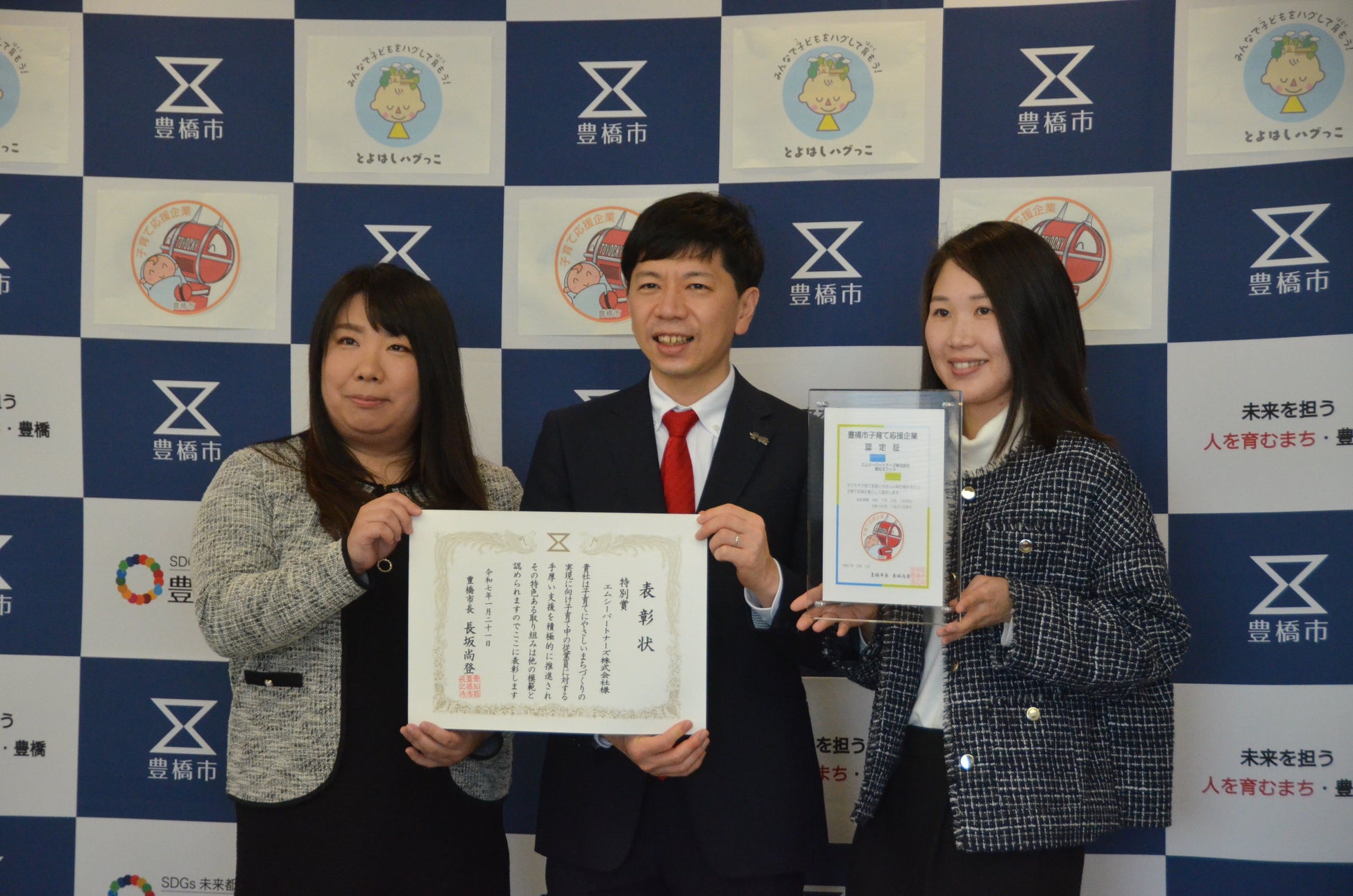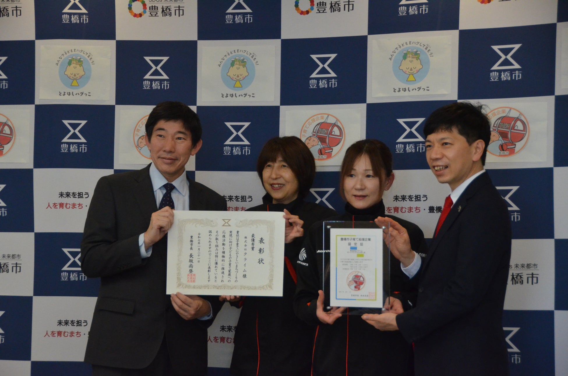 市民や従業員に対する子育て支援の取組を積極的に進めている企業を認定・表彰する豊橋市独自の制度で、2014年度に始まりました。