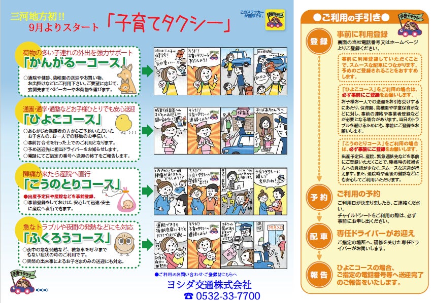 子育て家庭が安心して外出できる環境づくりのため、乳幼児を伴っての外出サポートや、子どもの送迎などを行う「子育てタクシー」の運行を実施。