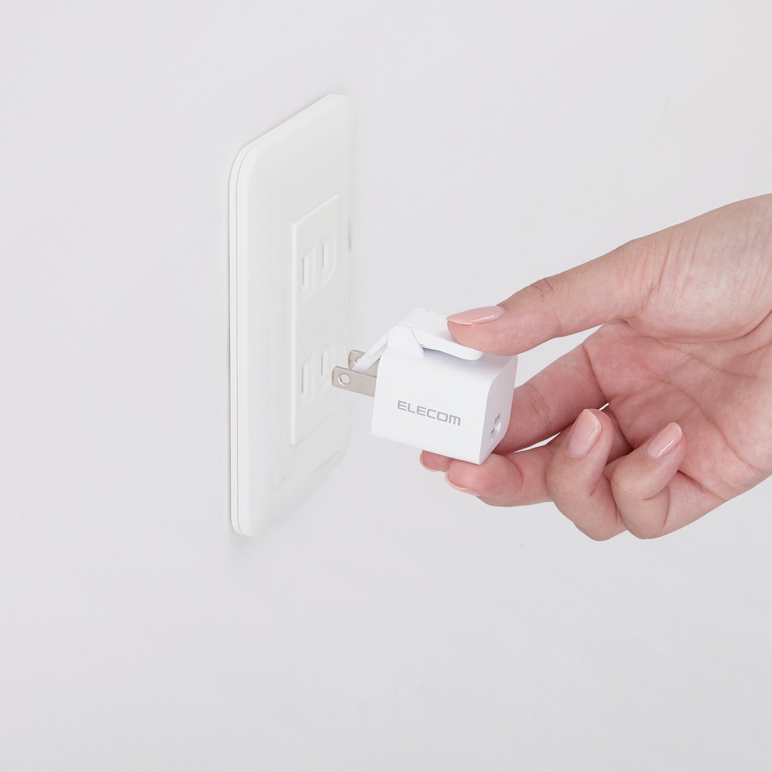 片手でレバーを押すと楽にコンセントやタップから軽い力で抜くことができるAC充電器です。力の弱い子どもや高齢者の方にもお使いいただけます。手のひらにすっぽり隠れるほど小さく軽量で、外出や出張などの際の持ち運びに便利です。