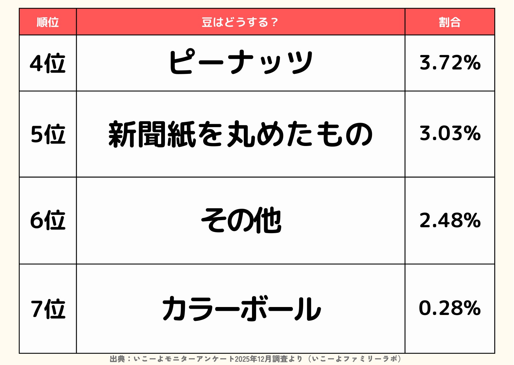 豆のかわりに「新聞紙を丸めたもの」「カラーボール」と答えた家庭もおり、誤飲防止や掃除のしやすさなど、安全性・後片付けへの意識が選択に反映されている様子がうかがえます。