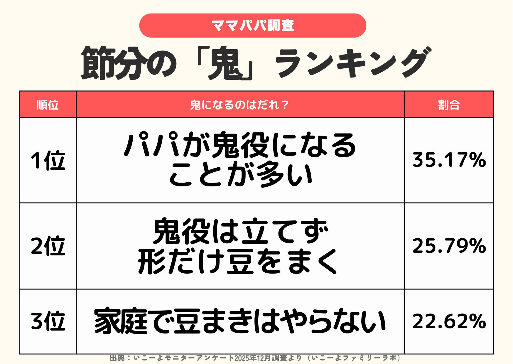 発表!節分【豆まき】ランキング2026 豆まきするのは2位「小分けの豆」豆まきの豆1位は?鬼なし?掃除しやすい?子供も親にも”やさしい節分”へ?/ファミリーの2月の過ごし方トレンド調査第2弾