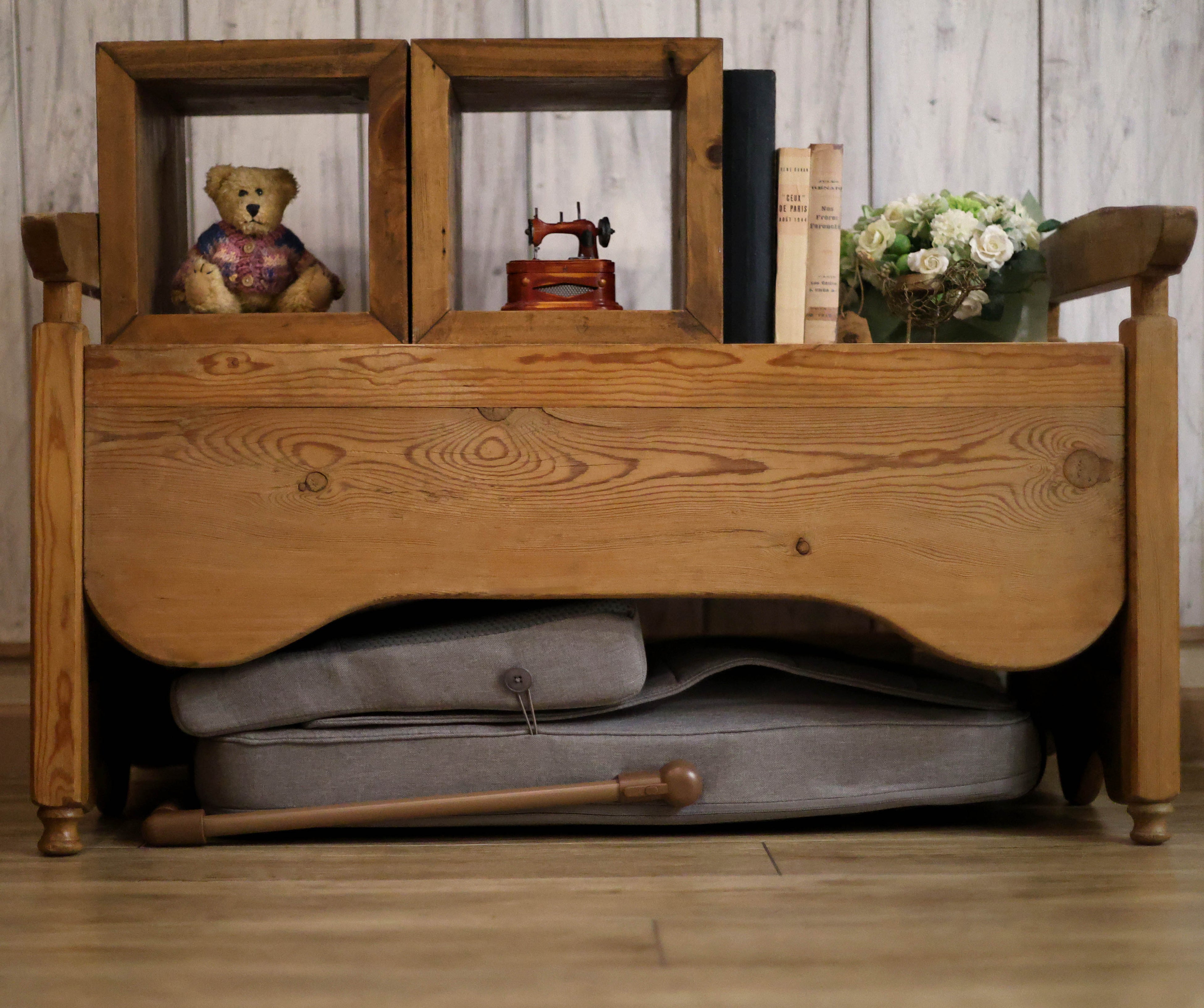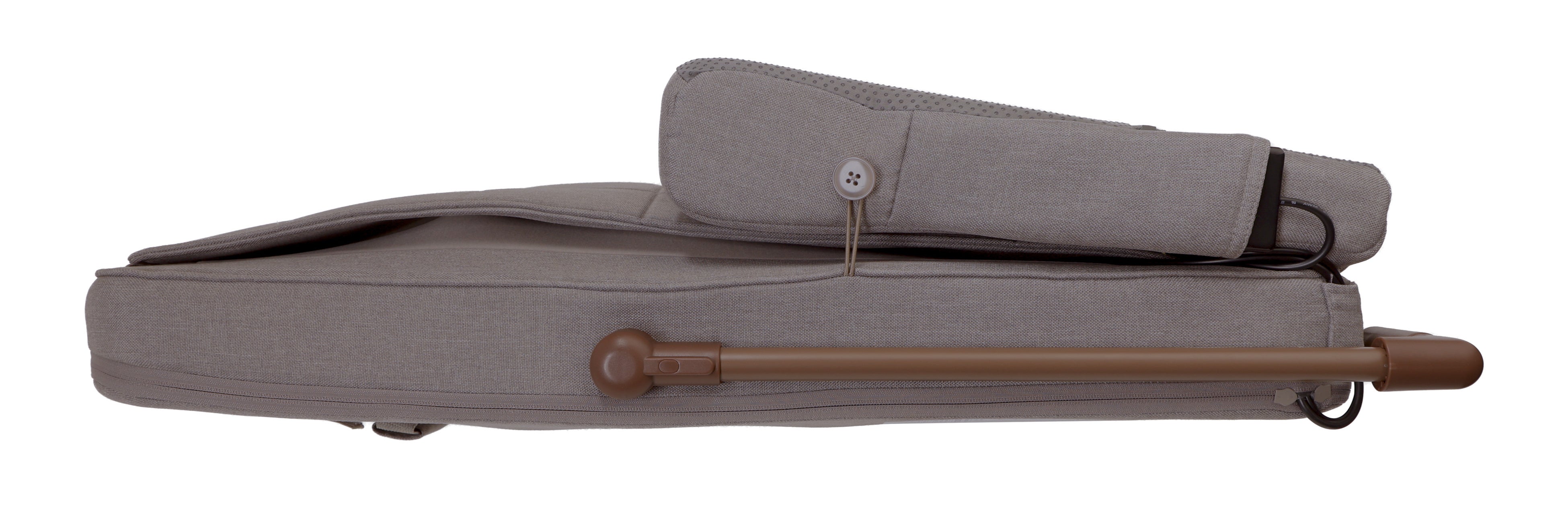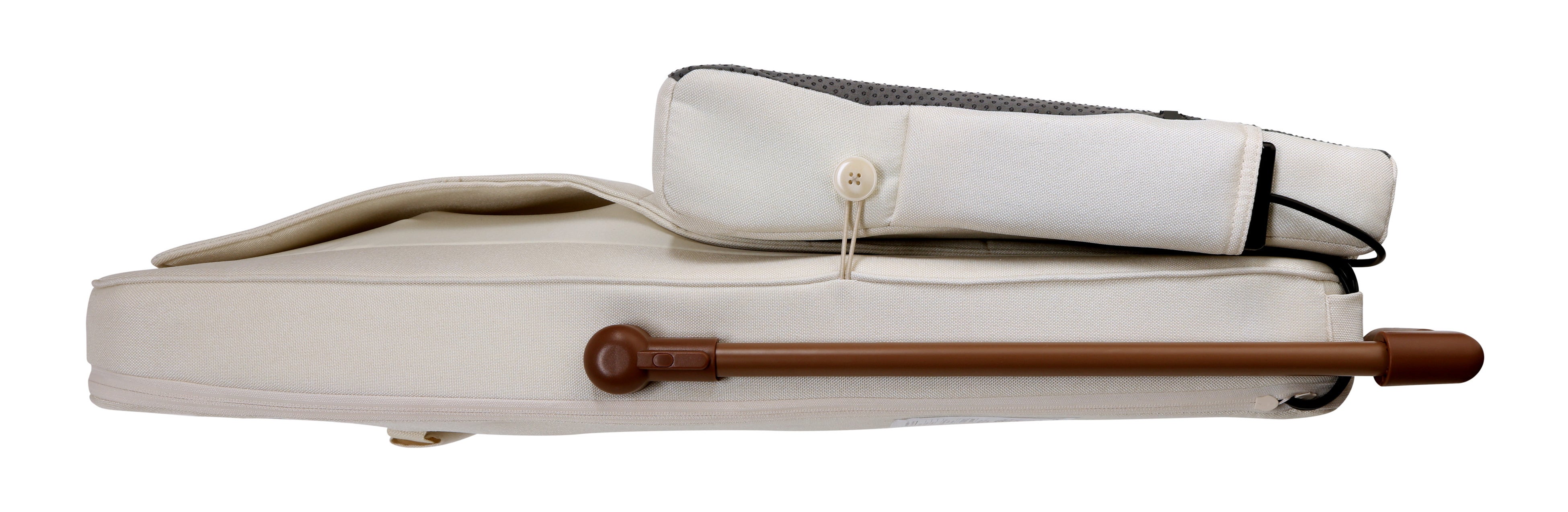 本製品は、座いす型のマッサージチェアです。収納時には座面部とスタンドを畳み、コンパクトになります。座面部は内側に折りたたみ、側面についている座面収納フック(固定輪)で固定することができます。厚さは約20cmとなるため、部屋の隅や家具のすきまにひっそりと収納することができます。
