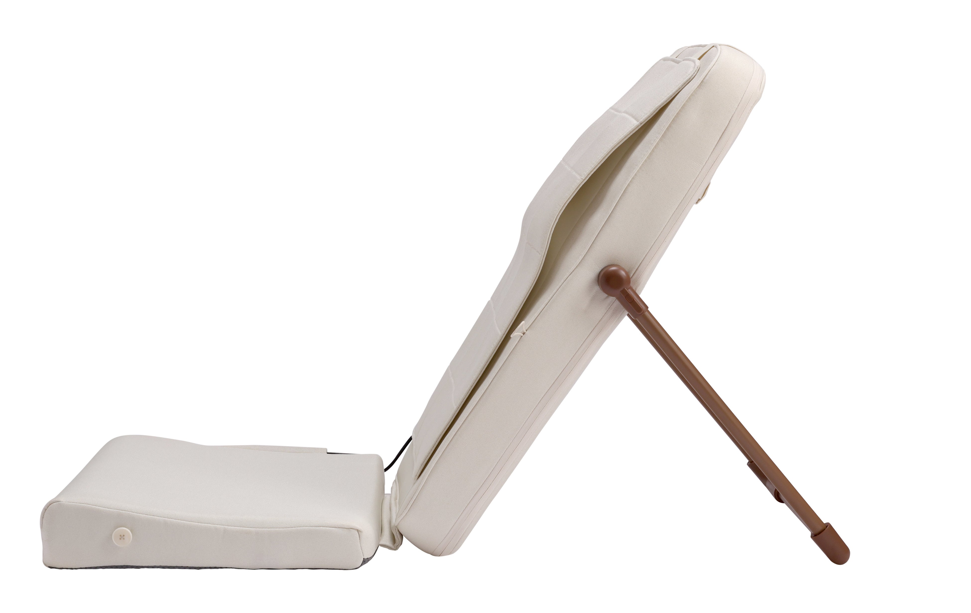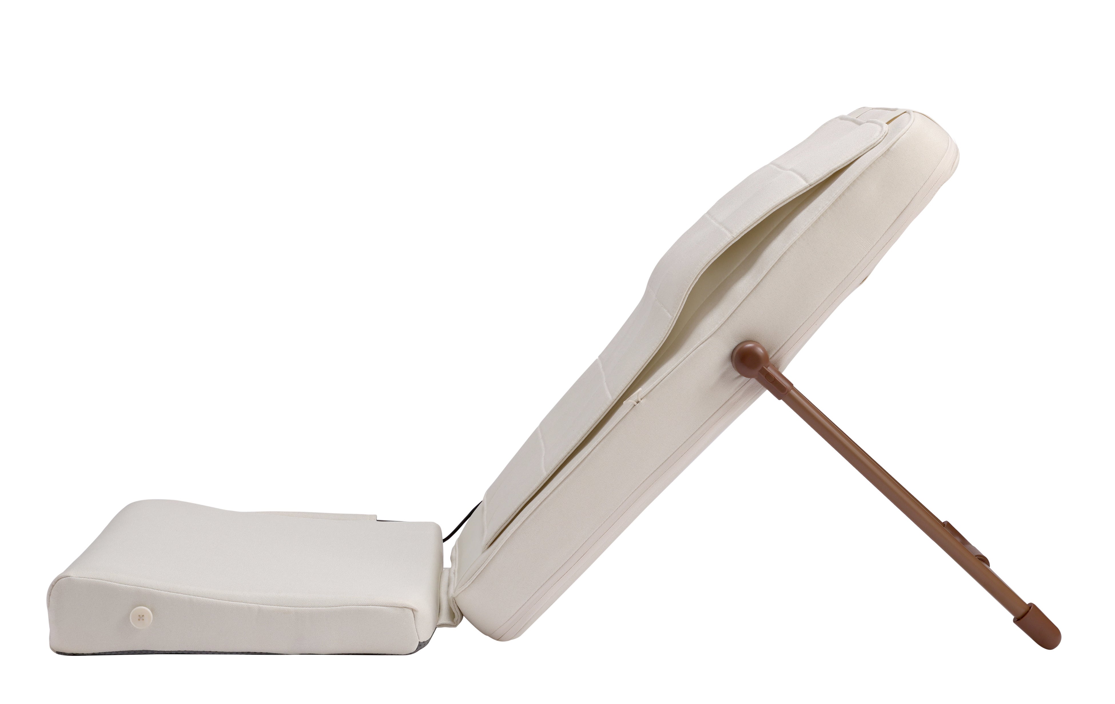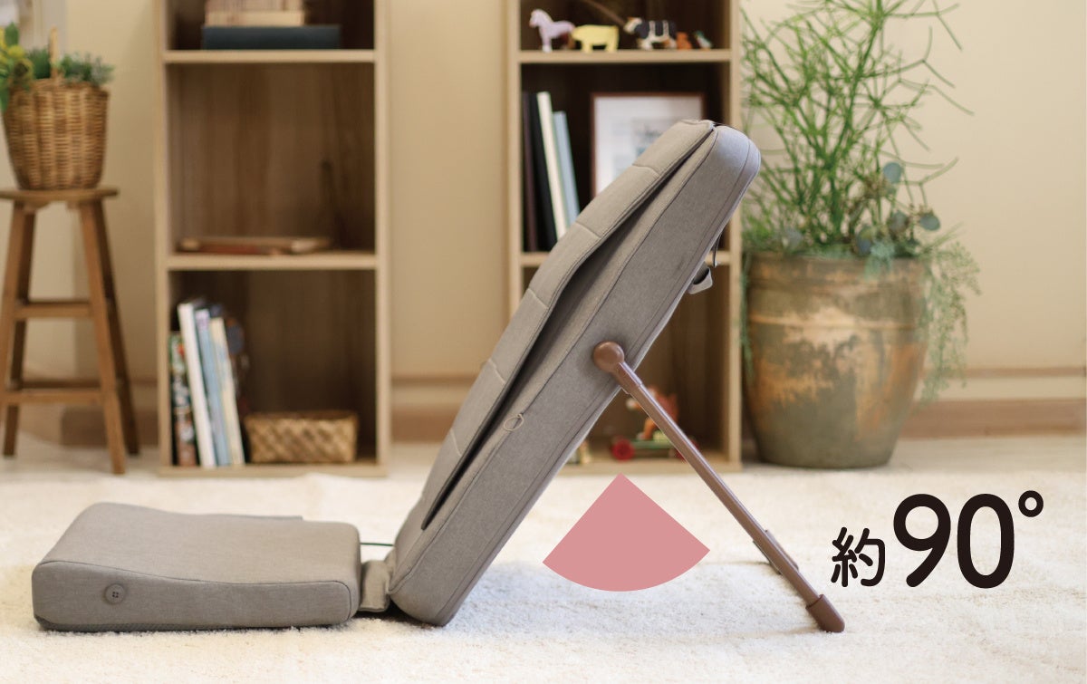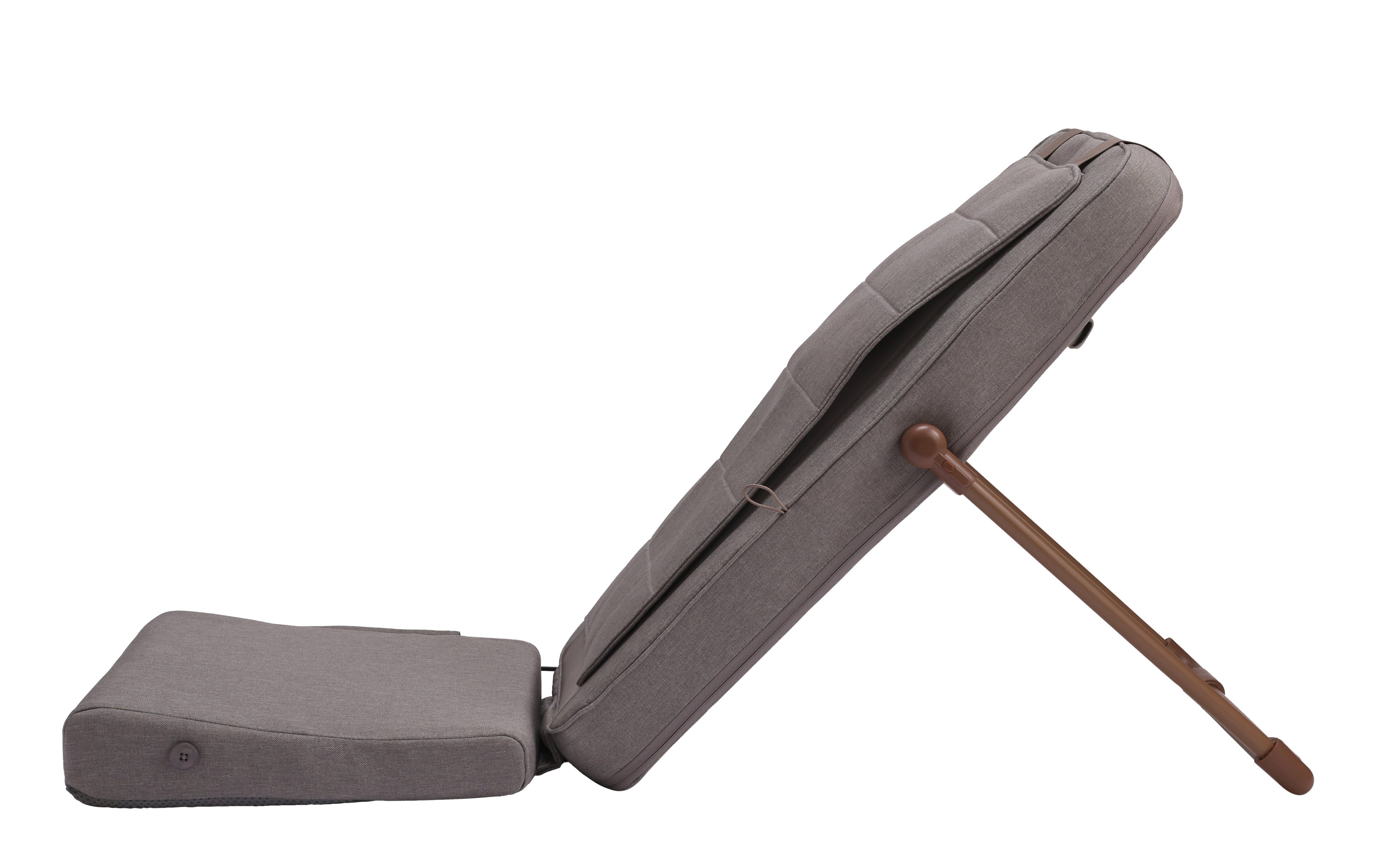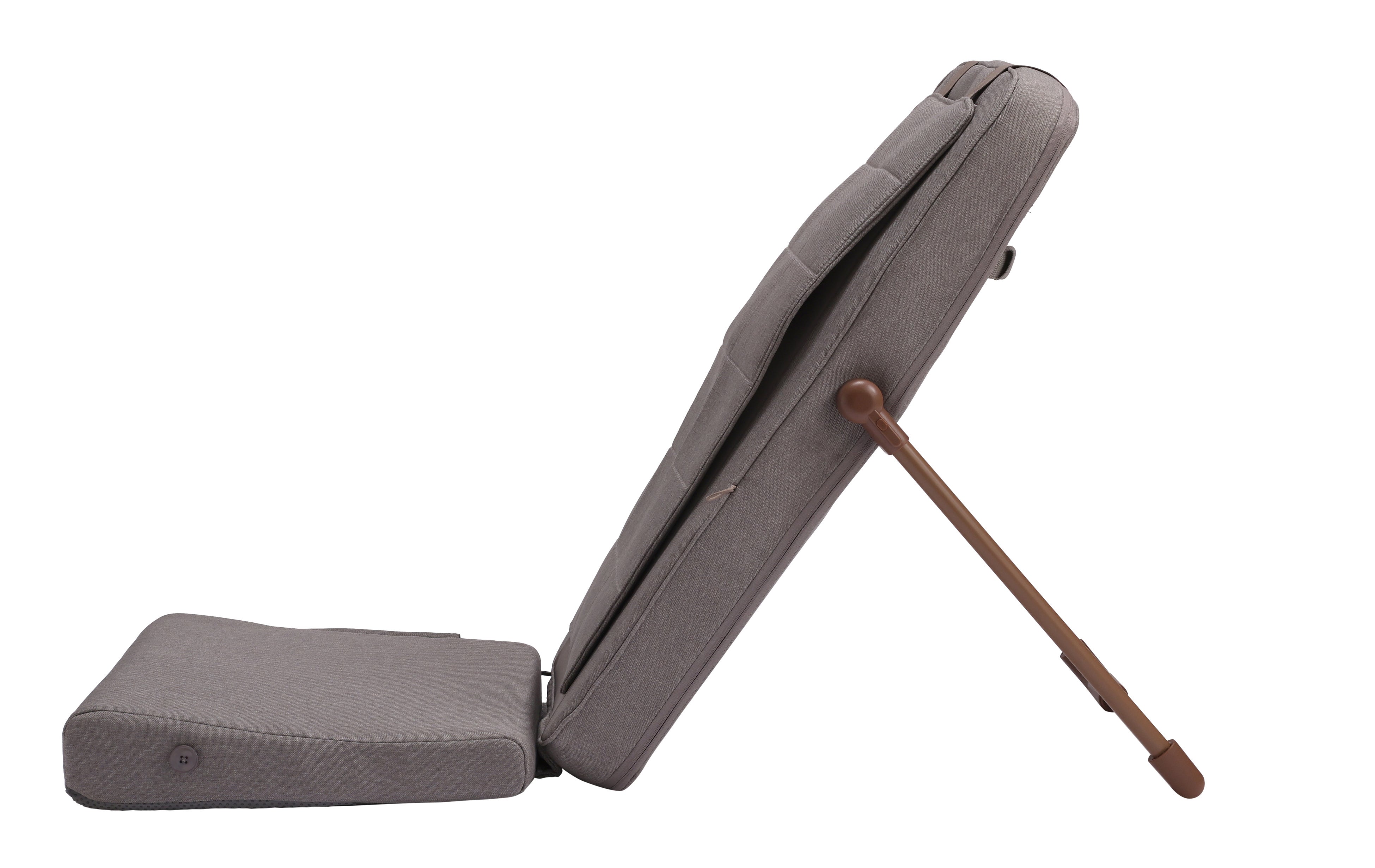 背面部についているスタンドを好みの角度に調節して使用できます。角度は約90度と約72度の二段階に調整が可能です。また、座面裏にはエンボス加工のすべり止めがついているため、スタンドを使用せずに、背もたれのある椅子やソファーなどに設置して使用することもできます。