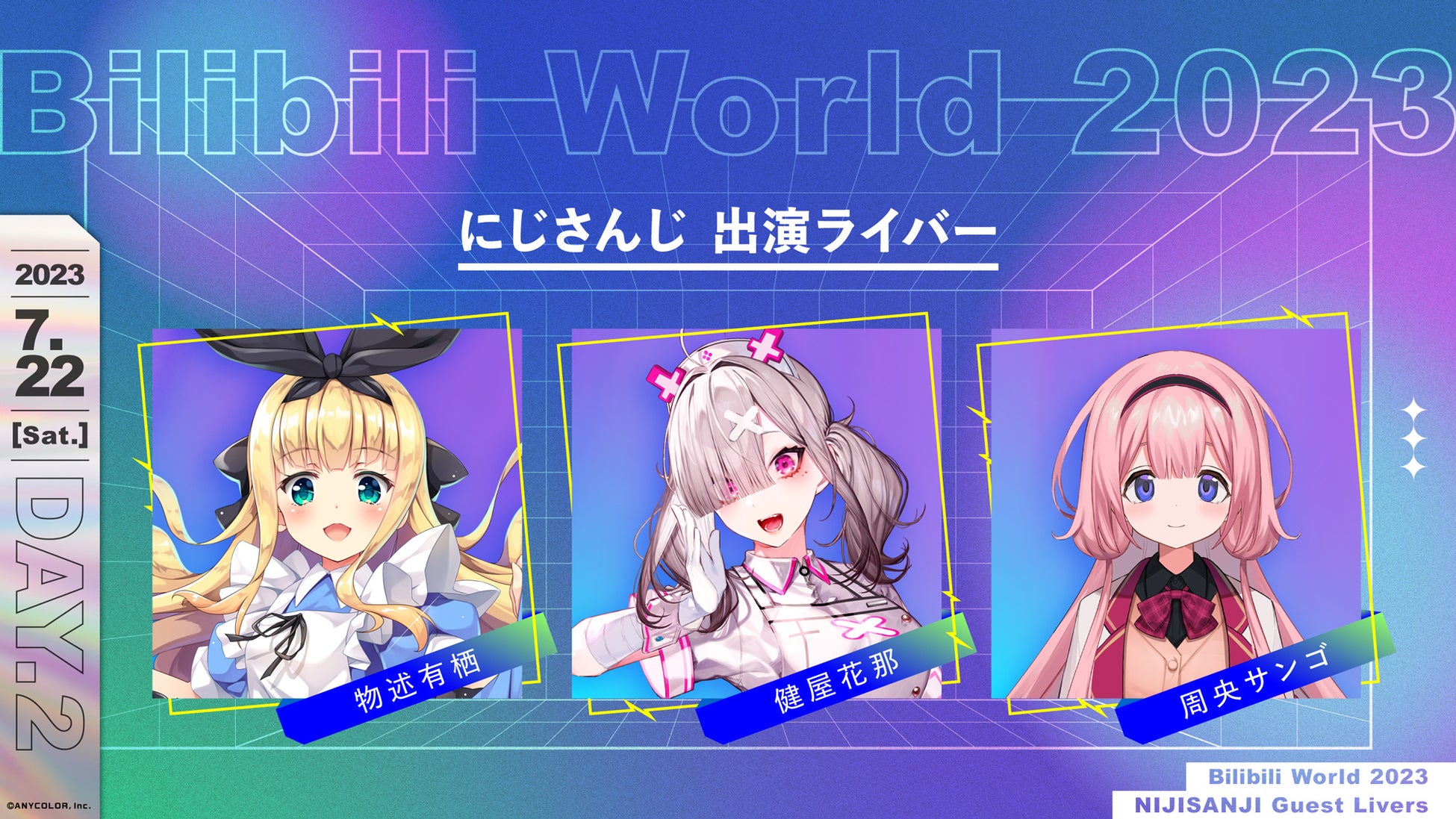 Bilibili World 2023「にじさんじブース」にて、2023年7月22(土)(Day 2)には物述有栖、健屋花那、周央サンゴ、2023年7月23(日)(Day 3)にはAlban Knox、Fulgur Ovid、Sonny Brisko、Uki Violeta