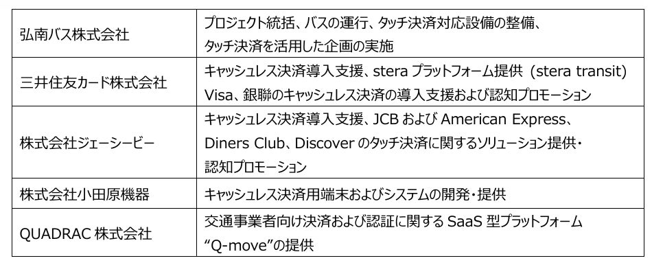 弘南バス株式会社(本社:青森県弘前市、代表取締役社長:工藤 智久)、三井住友カード株式会社(本社:東京都江東区、代表取締役社長:大西 幸彦)、株式会社ジェーシービー(本社:東京都港区、代表取締役兼執行役員社長:二重 孝好)、株式会社小田原機器(本社:神奈川県小田原市、代表取締役:丸山 明義)、QUADRAC株式会社(本社:東京都港区、代表取締役社長:高田 昌幸)は、2025年3月17日(月)より、三井住友カードが提供する公共交通機関向けソリューション「stera transit」を活用した、タッチ決済対応のカード(クレジット、デビット、プリペイド)や、カードが設定されたスマートフォン等による乗車サービスを開始することを発表します。