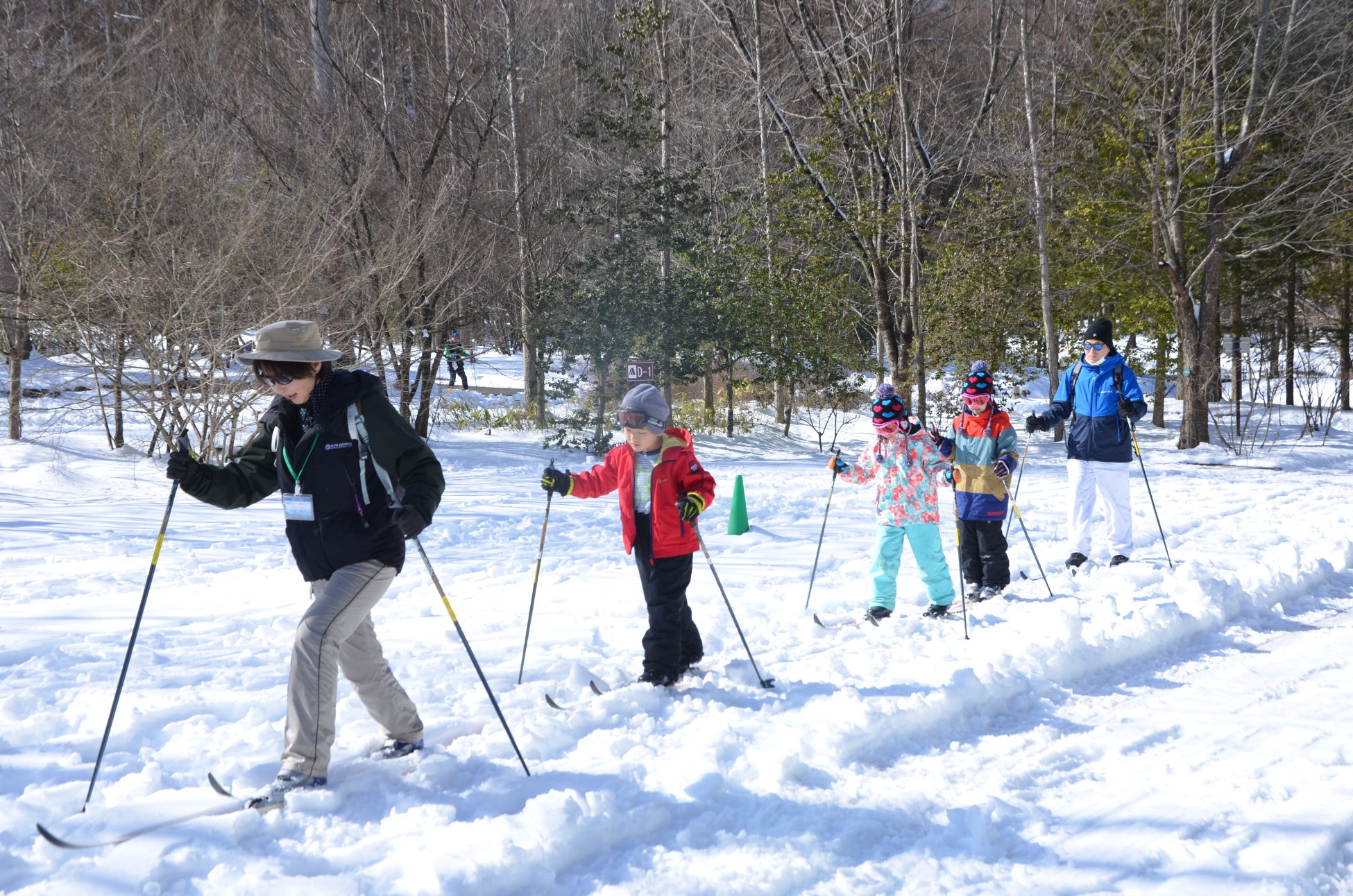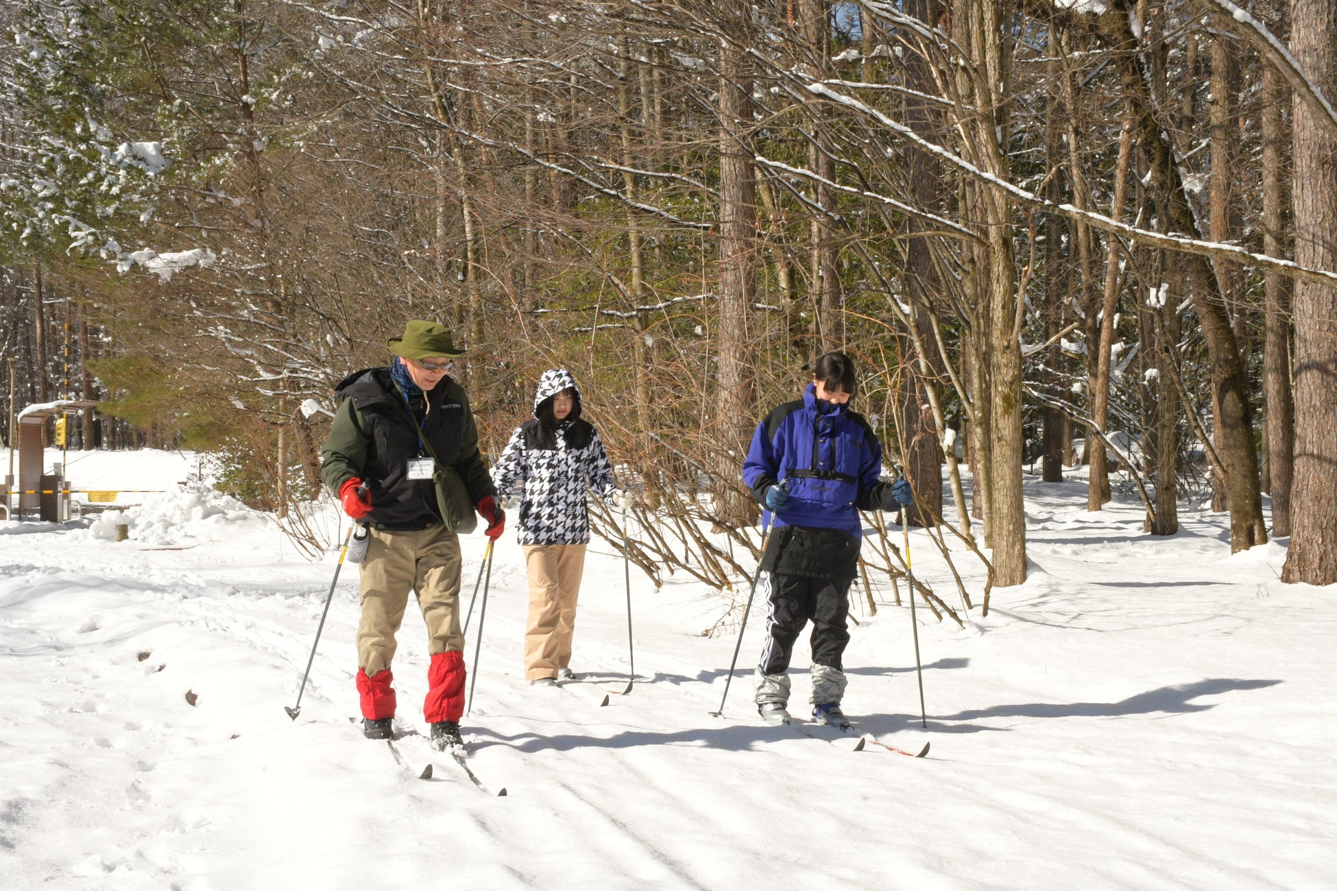 自然環境学習グループの公園サポーターによるレクチャーで、上り坂を登れるうえ身軽に動ける「歩くスキー」を満喫。スキー板を雪面から離さず滑らせる「すり足(滑走歩行)」、ストックを使ってリズム良く「押して進む」動作、さらにスキー板をV字に開いて斜面を上る「V字登行」等を体験します。