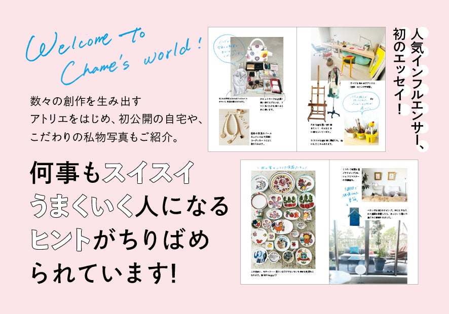 冒頭の口絵で、初公開の自宅やこだわりの私物写真もご紹介。「キャメアート」はじめ、数々の創作を生み出すアトリエのお写真も。ファンのみならず、素敵な住まいやお部屋づくりに興味のある方必見です。