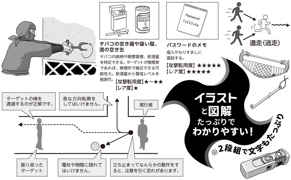 忍具や忍術、スパイの道具や諜報術、軍の装備や戦術、ハッカーのツールや攻撃手法などを関連づけながら学んでいきます。そうすることで、サイバーセキュリティ、ソーシャルエンジニアリング、物理的セキュリティを総合的に習得することができます。