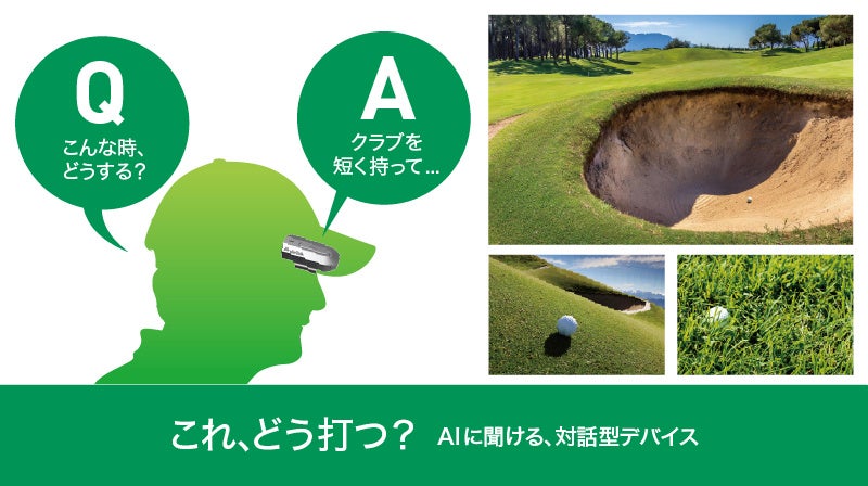 本製品はゴルフのラウンド中に音声で質問するだけで、AIが音声で回答する小型デバイスです。状況に応じた打ち方などのアドバイスから、不調の対策、ルールまでその場で聞くことができます。
